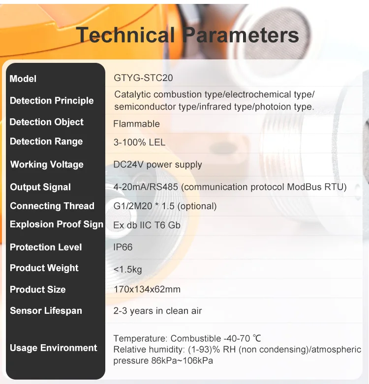 This is a fixed gas leak detector , it can detect Flammable and Explosive gas .The detect range is 0~5~10~100%vol ,the low alarm value is 2 , the high alarm value is 2.5%vol . The explosion-proof grade is Exd II CT6 , the protection type is IP66.