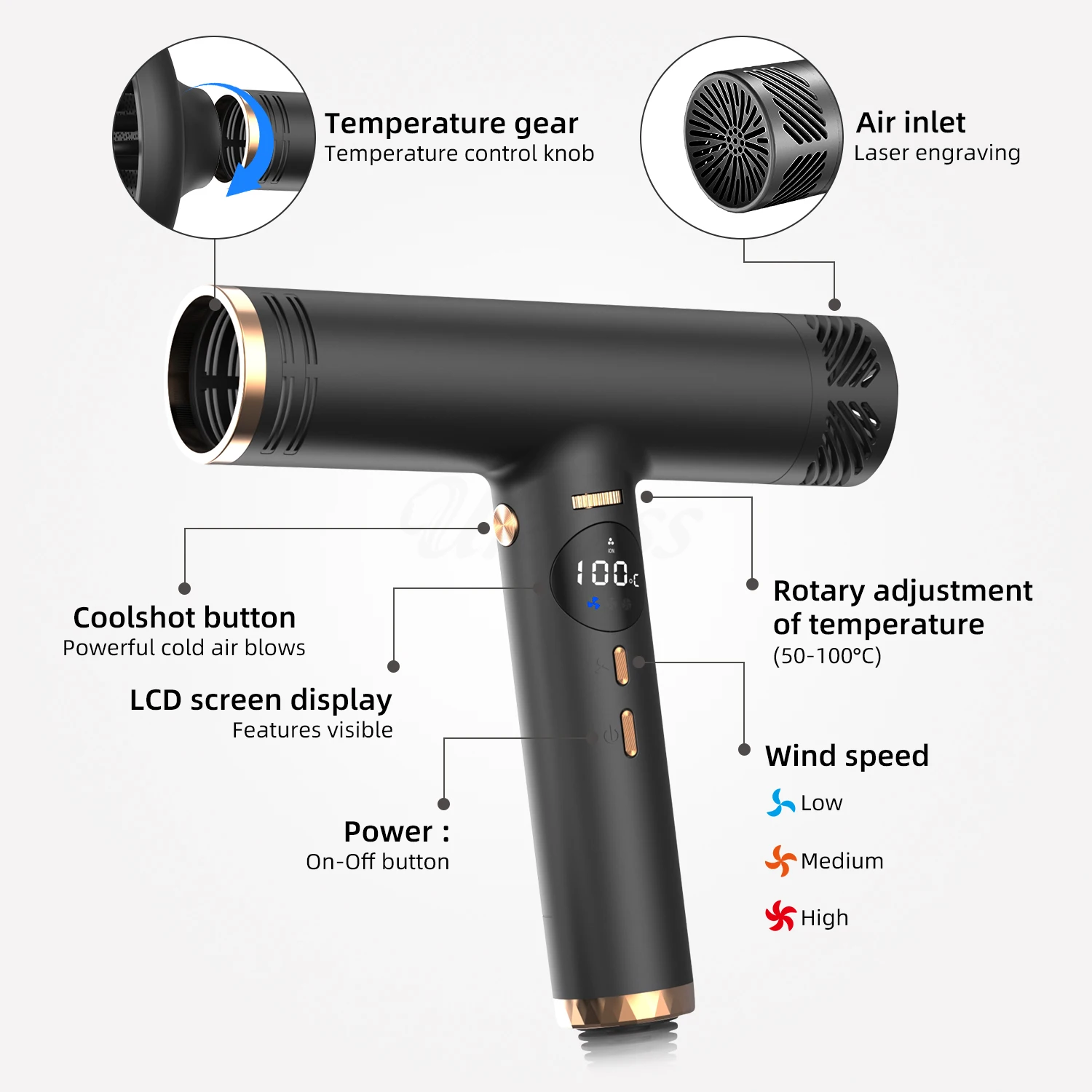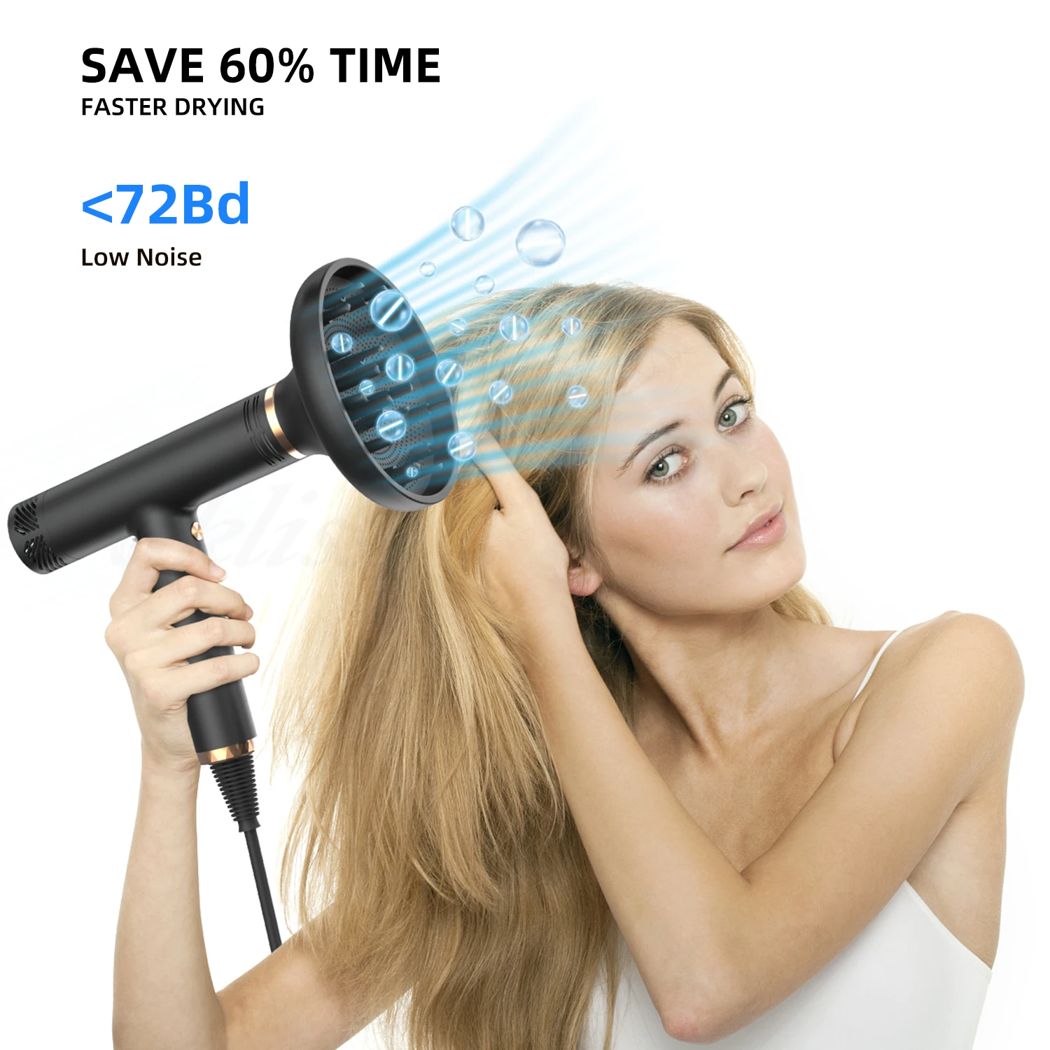 Powered by a 110,000 RPM high-speed brushless motor, wind speed reaches 23m/s, dry hair in a short time