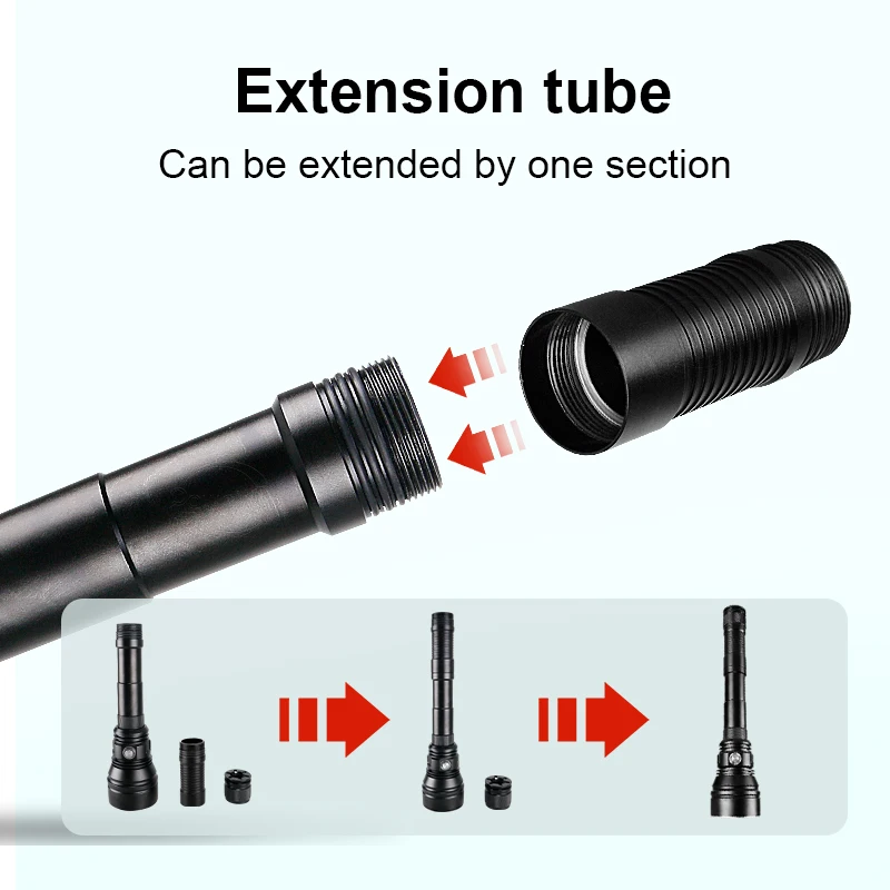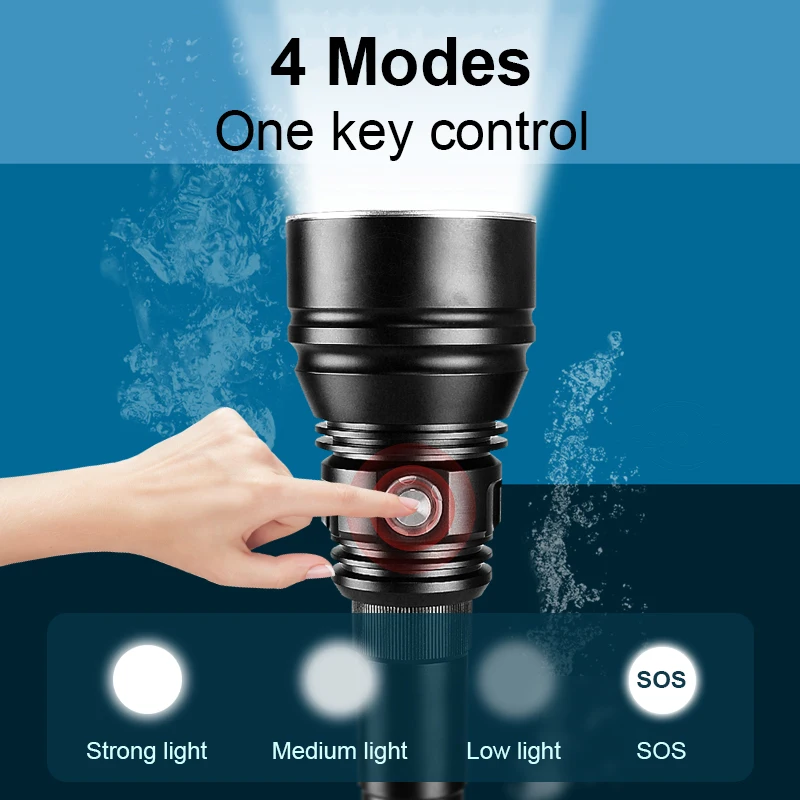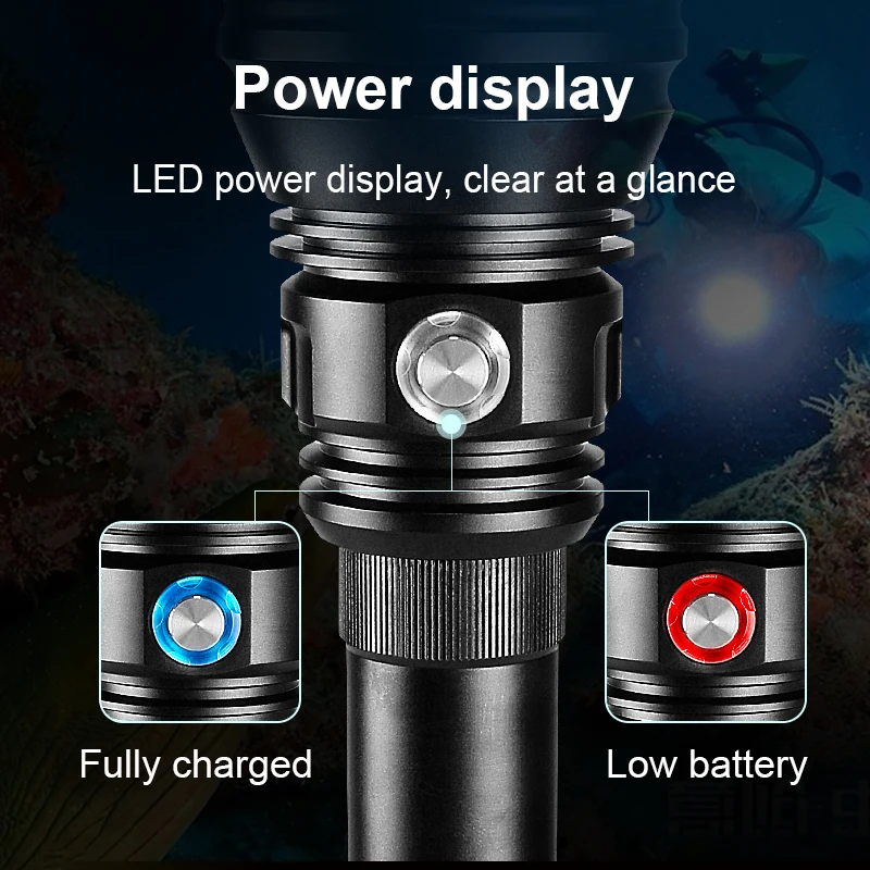 In 2021, the latest and strongest upgrade XHP160 ultra-bright LED diving flashlight, XHP160 high-bright wick, comprehensively enhance the underwater lighting performance, XHP160 is the first choice for underwater activities, also suitable for outdoor activities such as families. It is more advanced than other diving flashlights, and the diving depth can reach 800M. The product material is made of super aviation aluminum alloy, with IP68 waterproof effect, which can easily handle more than ten hours underwater. This is a professional diving LED flashlight. It is the powerful and brightest wick in . It allows you to dive freely. Its brightness is beyond your imagination.