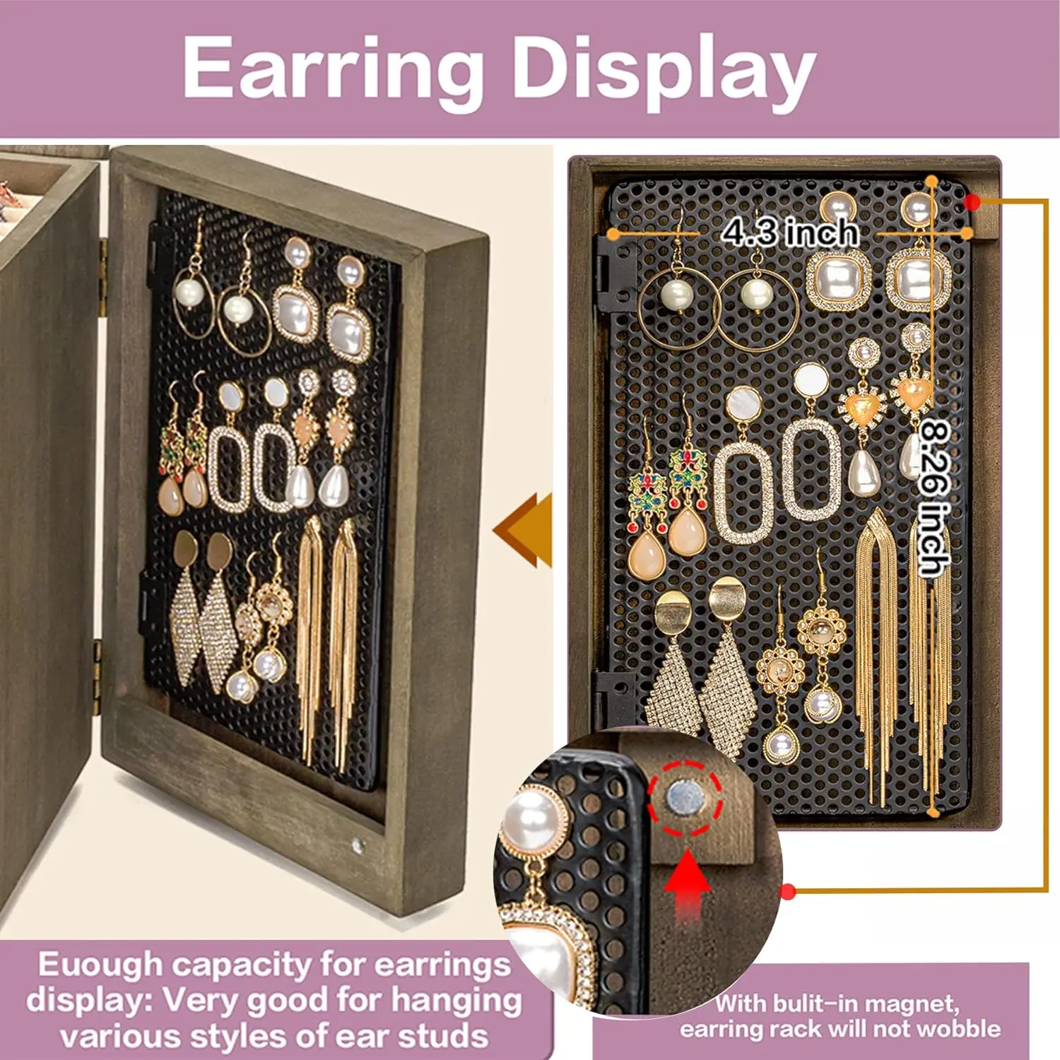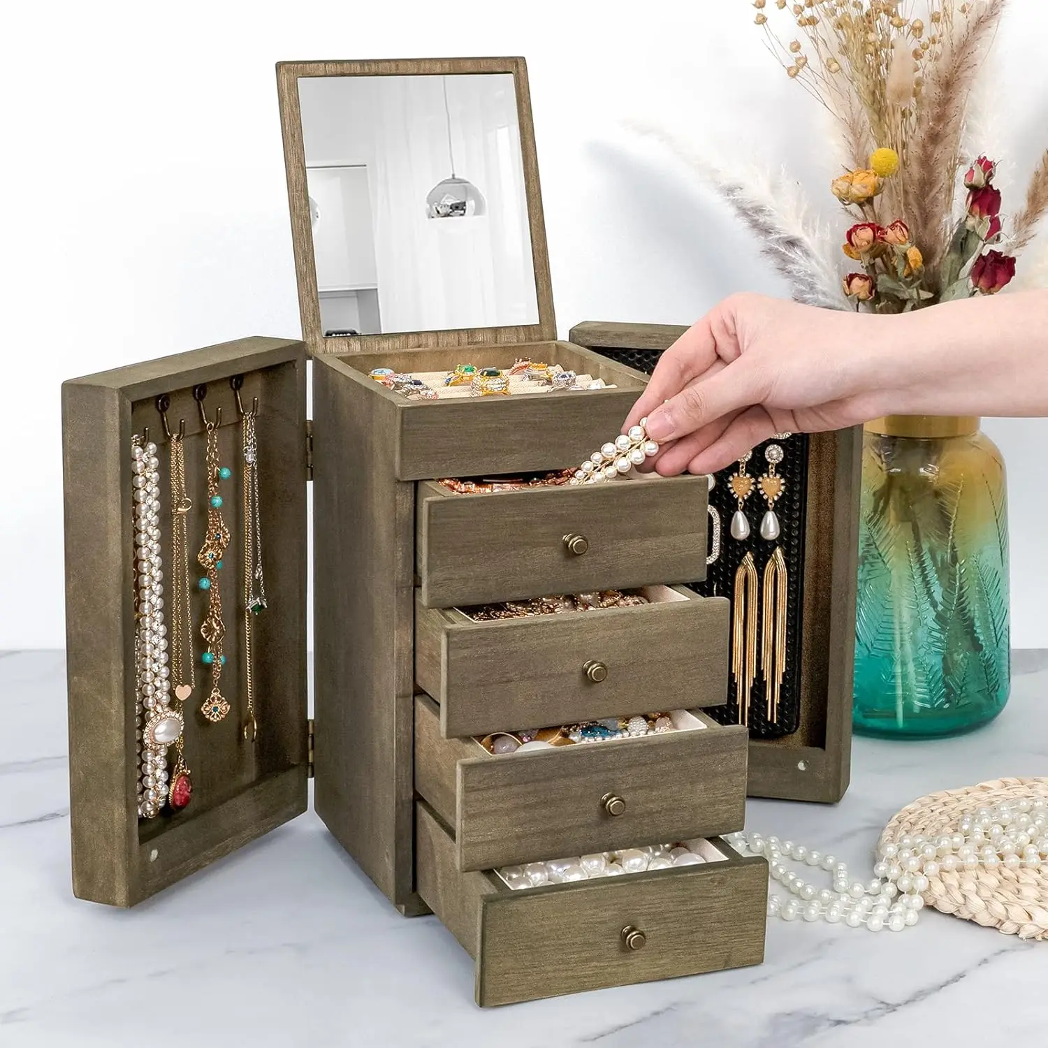 - ❤Large Capacity: The top layer has a built-in mirror and ring tray, 4 pull-out drawers keep your jewelry away from getting messed up, easily store different sizes of jewelry, even necklaces, bangles, and big earrings like hooped earrings. 2 side doors for hanging chunky necklaces and plenty pairs of earrings.