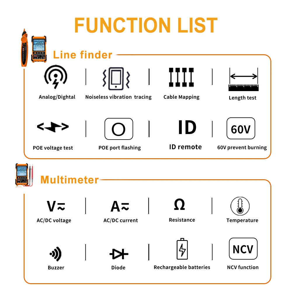 Multifunctional Cable Tester: This cable tester has the function of analogue tracing, cable mapping, PoE voltage measuring, digital tracing sensitivity adjustable, etc.