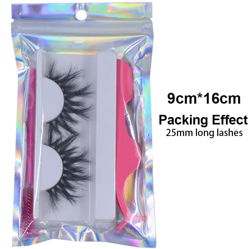 9*16cm bag can put into both 1pair of 25mm long lashes / 3D regular length eyelashes. also can put into 1pcs of tweezer and 1pcs of lash brush.