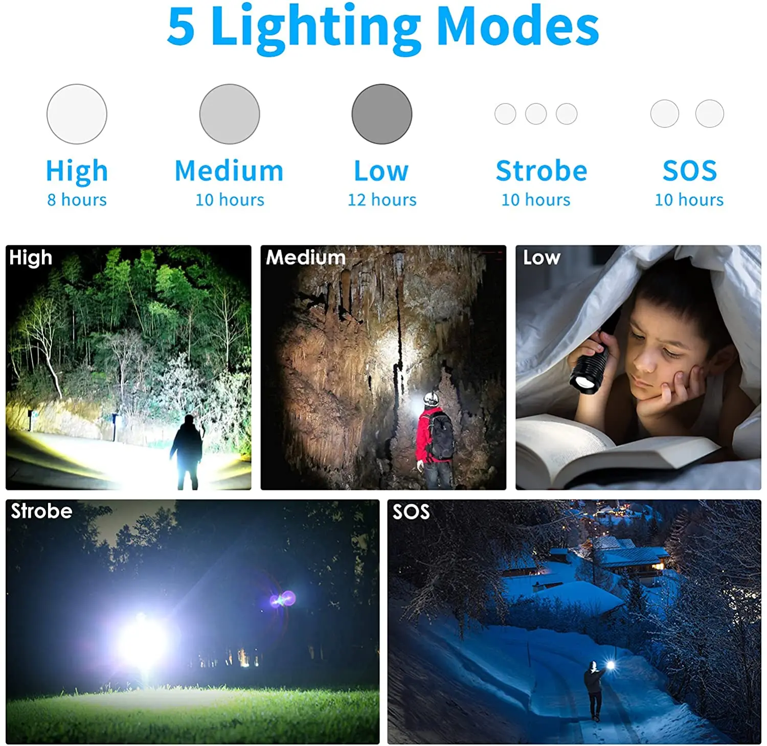 Package C:1*flashlight,1* 26650 rechargeable battery,1*18650 battery plastic tube,1* AAA battery holder,1* USB cable,1* lanyard