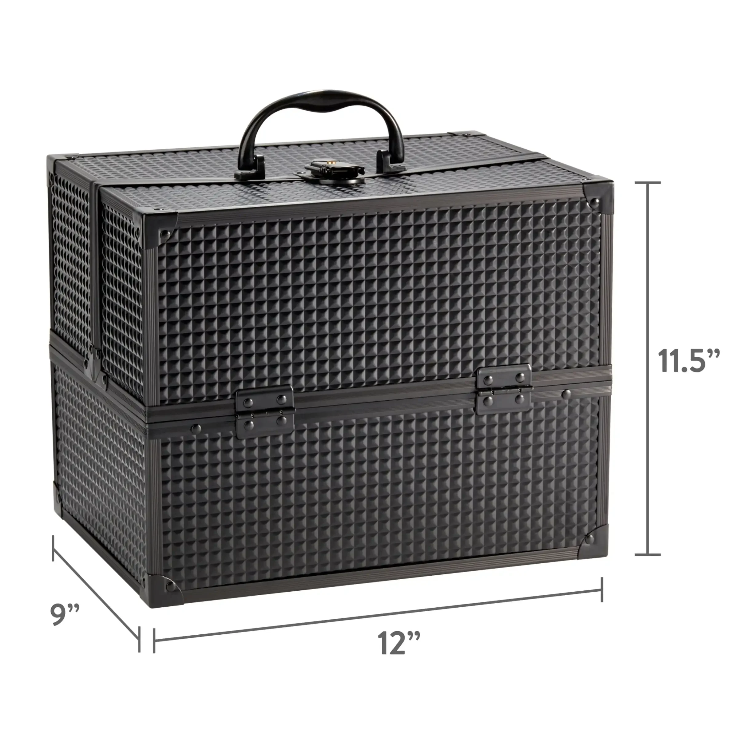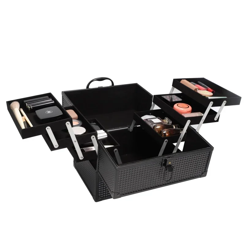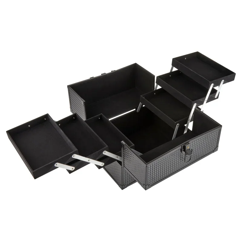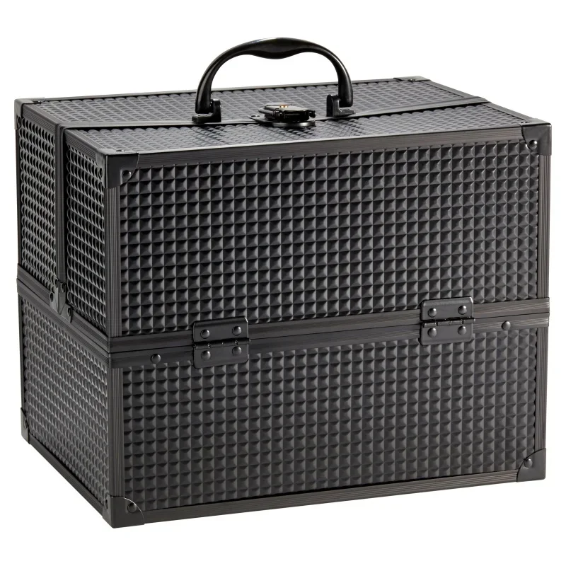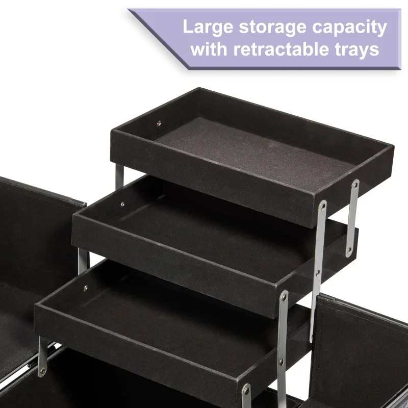 Large makeup train case cosmetics organizer, matte black, 6 flats, 8.6×11.8×9.4