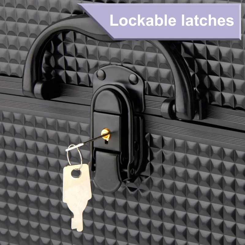 This classy and sophisticated Large Matte Black Makeup Train Case Cosmetics Organizer will keep your beauty essentials arranged in style. This makeup train case is designed with six retractable trays and a deep bottom compartment to keep your cosmetics organized. Made with an aluminum frame and reinforced corners for better protection, the organizer also features a water resistant surface for added protection. The top of the box features a sturdy handle so you can carry it anywhere, and the lockable latches with key will keep your belongings secure. Measuring 8.6 inches wide by 11.8 inches long by 9.4 inches tall, there is ample space for all of your cosmetics from lipsticks to eyeliner, brushes to essential oils, palettes and bottles, and everything in between. Keep your cosmetics organized and ready to go at a moment’s notice with the Large Matte Black Makeup Train Case Cosmetics Organizer.