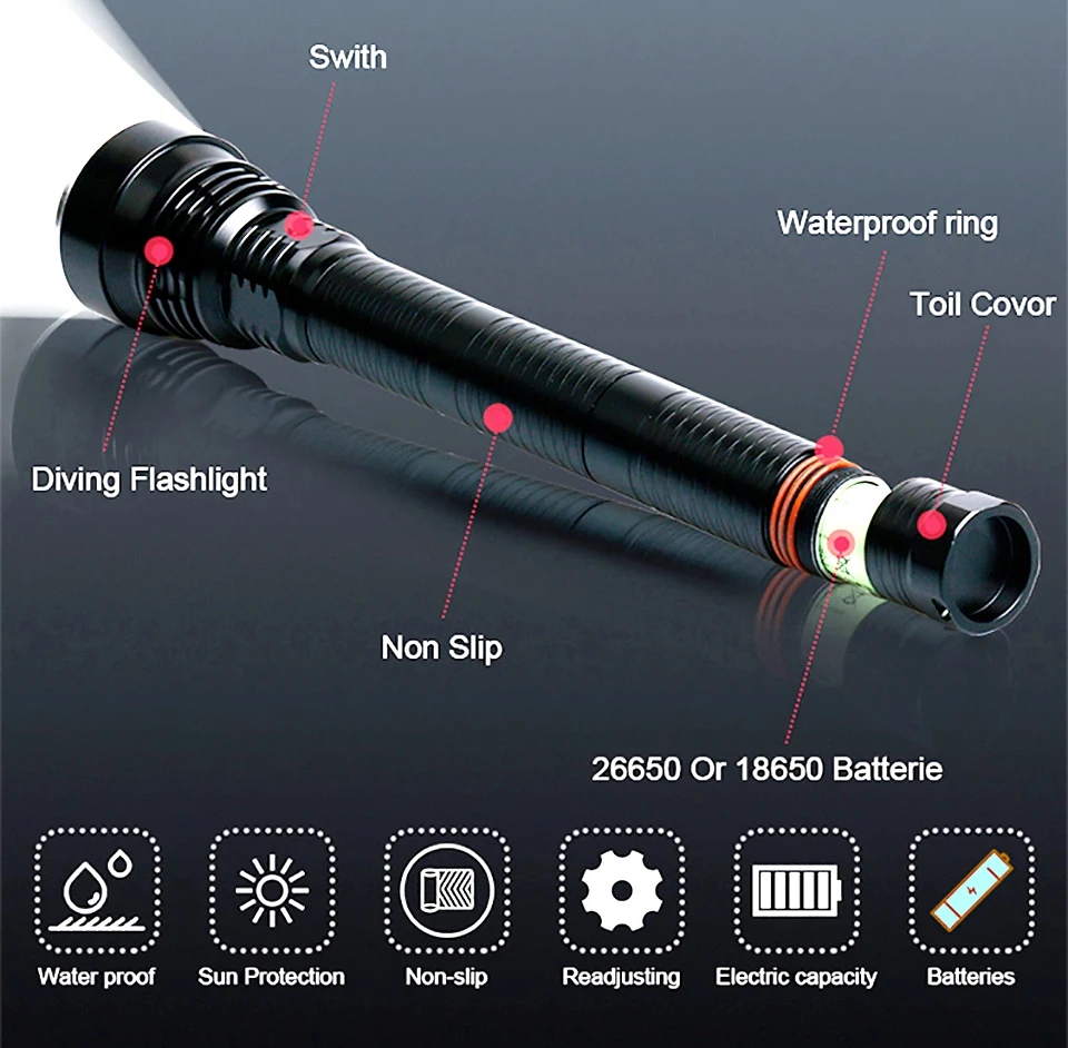 Suitable for deep sea diving, night lighting, work, scuba diving, deep sea fishing, hunting,camping,etc.