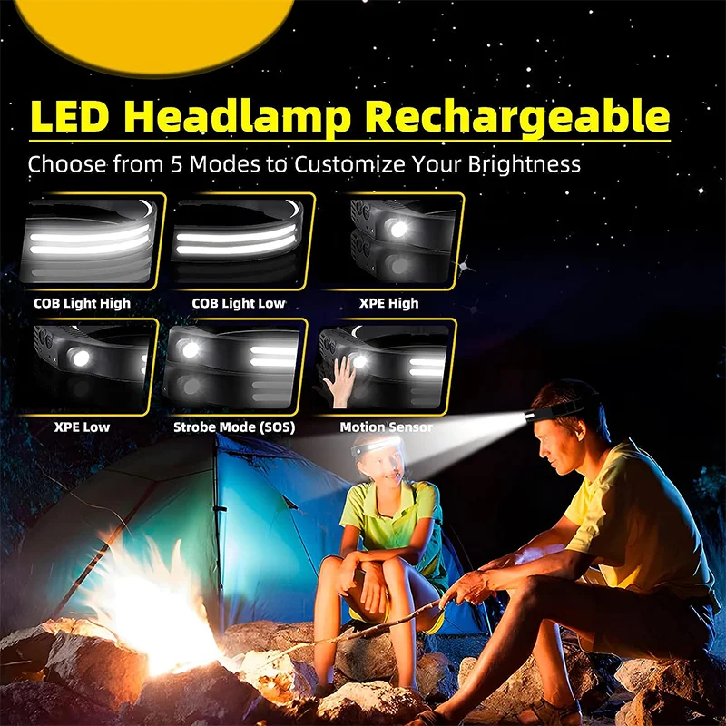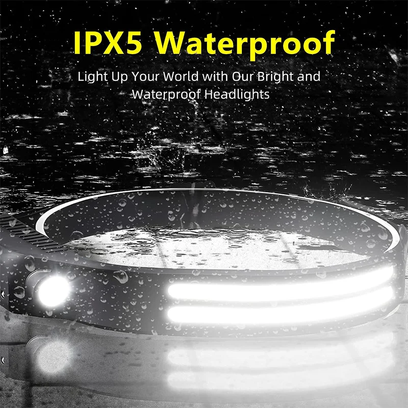 [5 Types of Lights and Sensors] Najiaxiaowu headlamp have 5 light modes: COB high brightness (100%) / COB low brightness (40%) / XPE side light high brightness (100%) / XPE side light low brightness (40 %)/Flash mode, lightly press the power button to switch the first four modes, in any light mode, long press the power button to enter the flash mode. After selecting any lighting mode (not flash mode) to activate the sensor, you can turn on or off the headlights by waving your hand