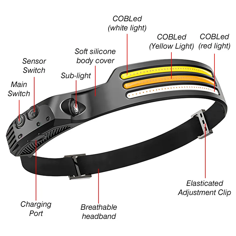 • [5 Types of Lights and Sensors] Najiaxiaowu headlamp have 5 light modes: COB high brightness (100%) / COB low brightness (40%) / XPE side light high brightness (100%) / XPE side light low brightness (40 %)/Flash mode, lightly press the power button to switch the first four modes, in any light mode, long press the power button to enter the flash mode. After selecting any lighting mode (not flash mode) to activate the sensor, you can turn on or off the headlights by waving your hand