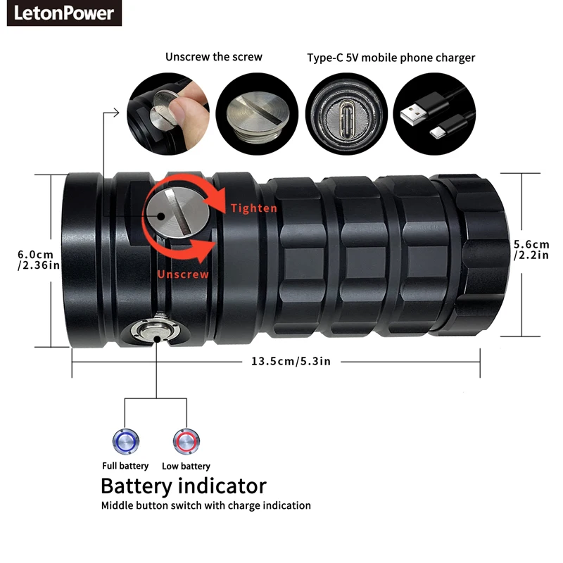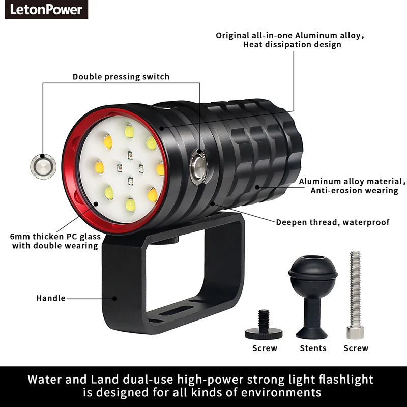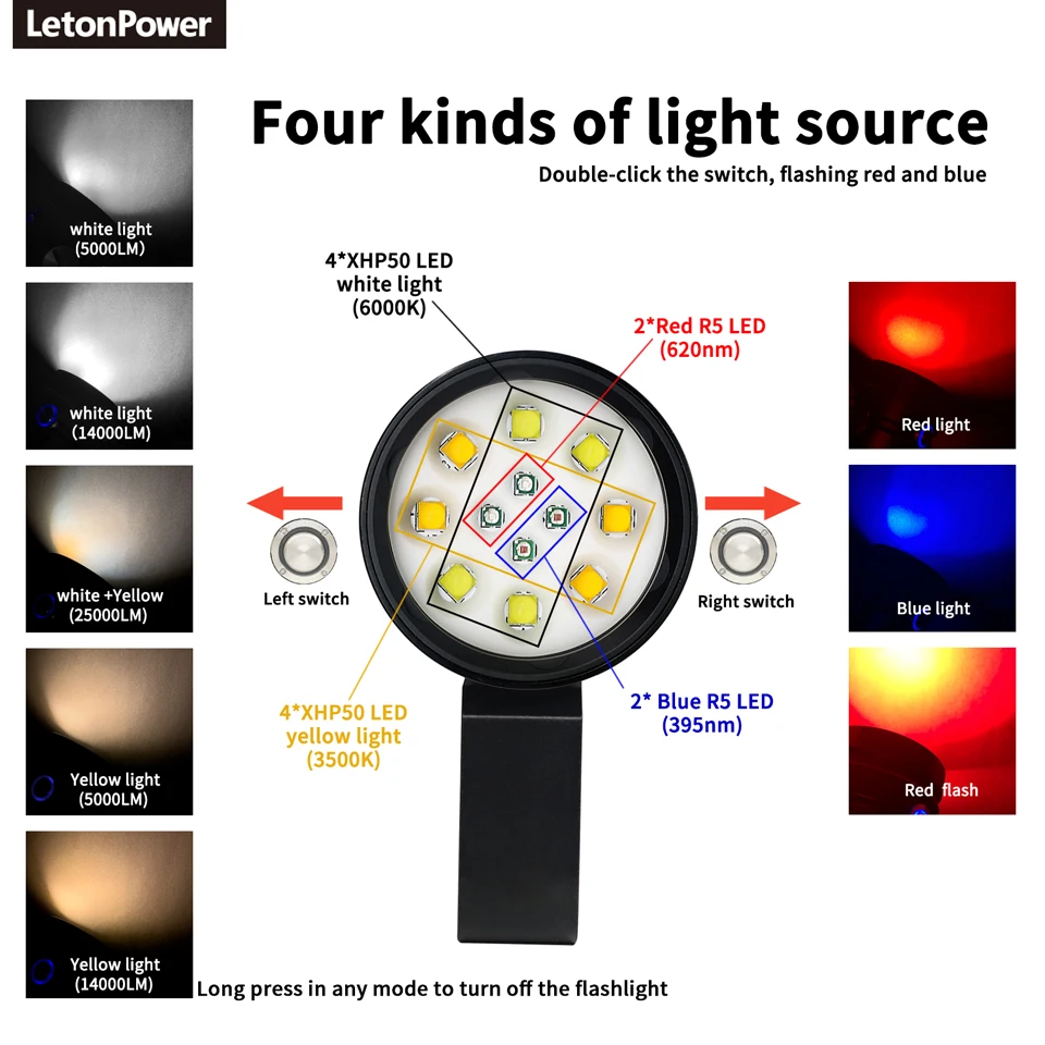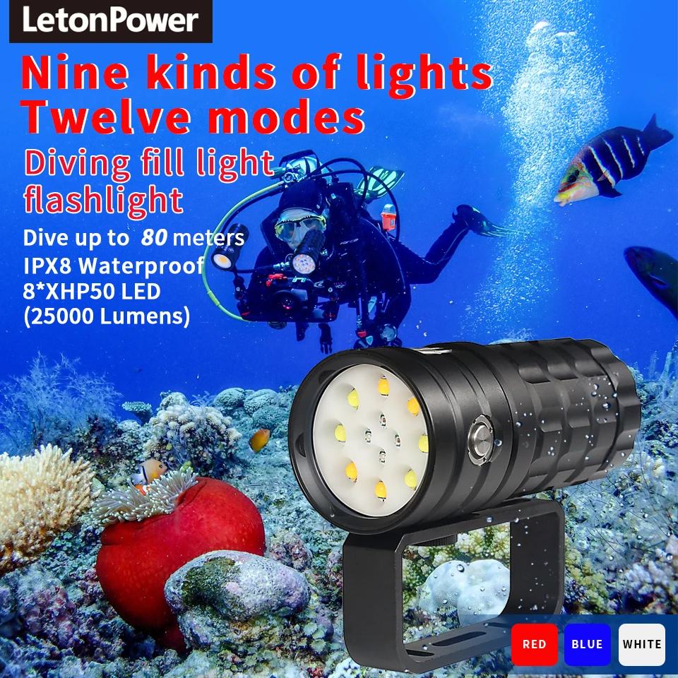 LetonPower Diving Flashlight 25000Lumens underwater flashlight 100m scuba dive light Type-C Charging underwater video light
