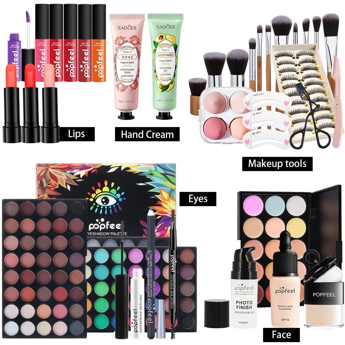 The all-in-one makeup gift set including(as the pics) eyeshadow palette, lipstick, lipgloss, cream concealer, makeup brush, face makeup, eyebrow pencil, mascara, primer, eyebrow Pencil, powder puff, hand cream, False Lash.