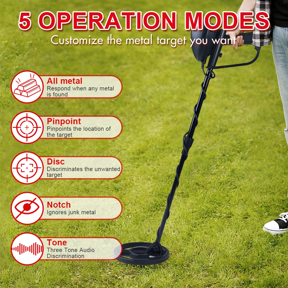 Three Audio Tone with High Accuracy: Metal detector has distinctive audio tone – a low tone, a medium tone and a high tone displayed on the interesting icon that can distinguish different metals. DISC mode helps you eliminate target categories and improve your detecting efficiency.