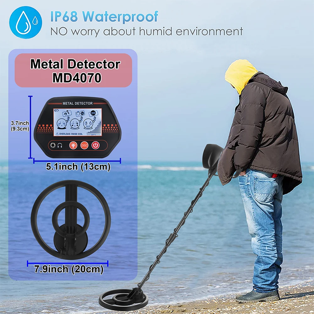 IP68 Search Coil: The search coil adopts IP68 hot melt sealed waterproof technology, 7.8" diameter search coil and the stem enable you to use metal detector to explore under water, perfect for detecting on the beach or in the stream(NOTE: the control box can not be put in the water).