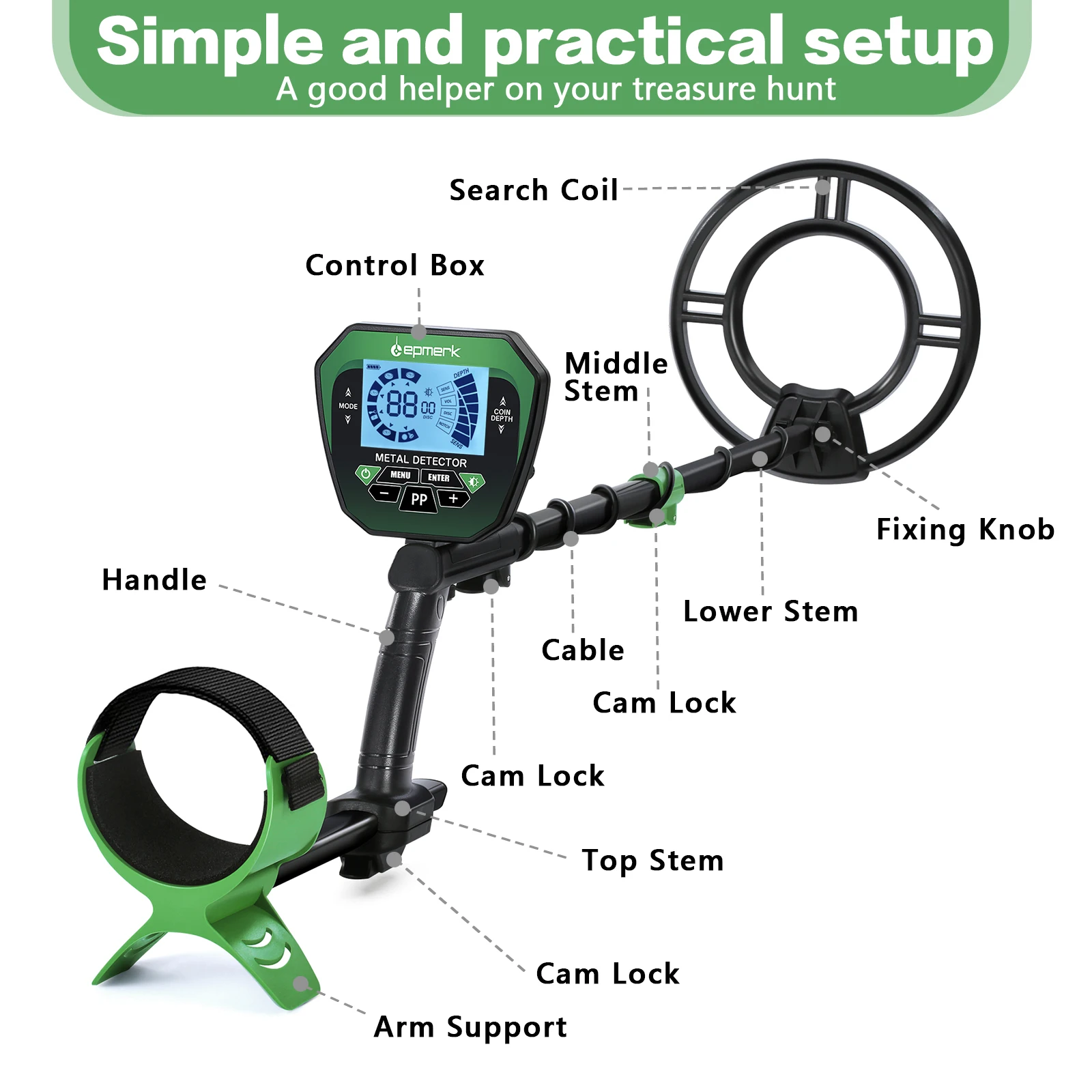 【Ergonomic Design】The lightweight metal detector is equipped with an adjustable stem for gold detector enthusiasts of different heights. Ergonomic armrests help you save energy and no wrist pain for long time use.