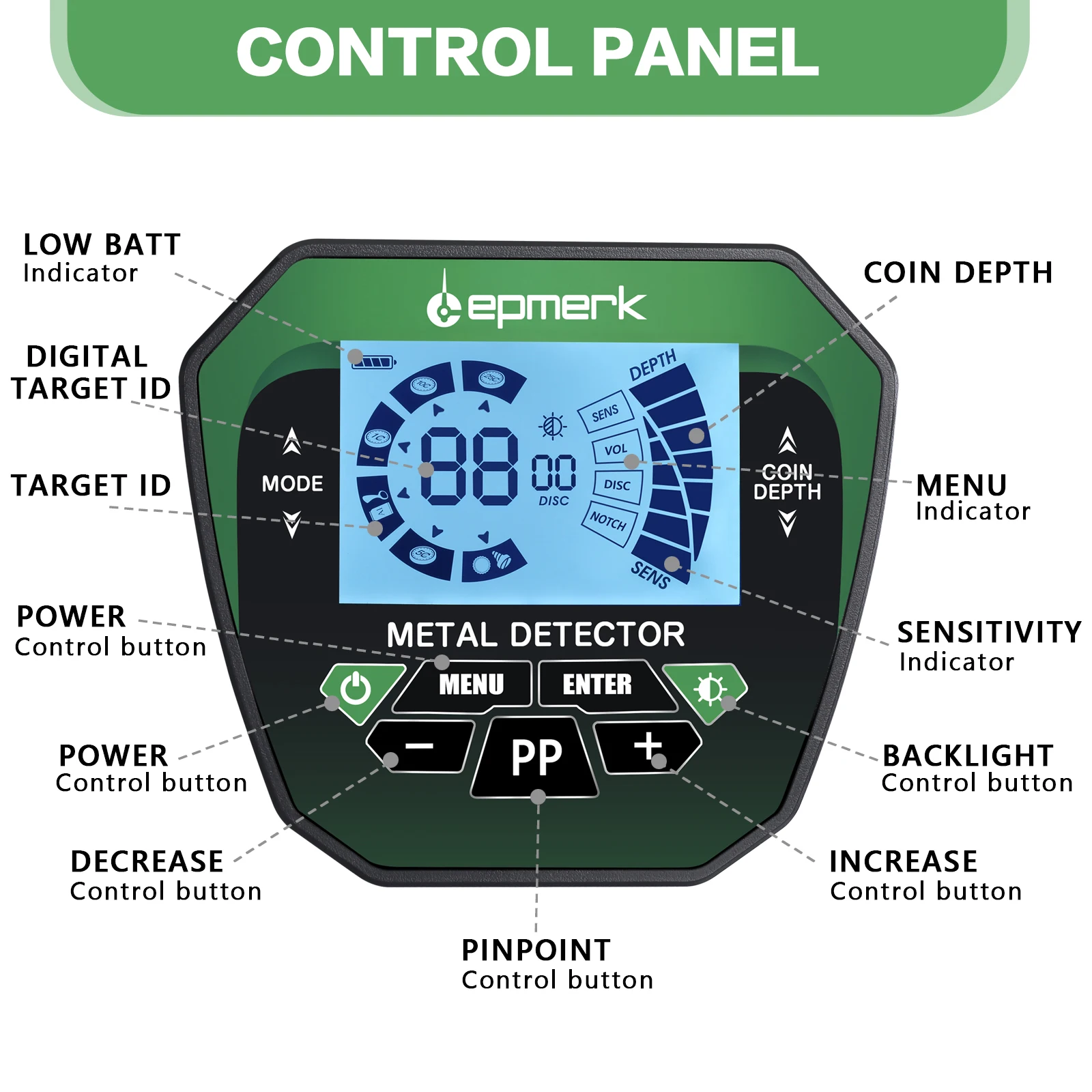 【LCD Display】Shows the probable type of metal, the depth of the target, range of DISC, the level of SENS and volume, as well as battery condition. It also has digital display for target ID.