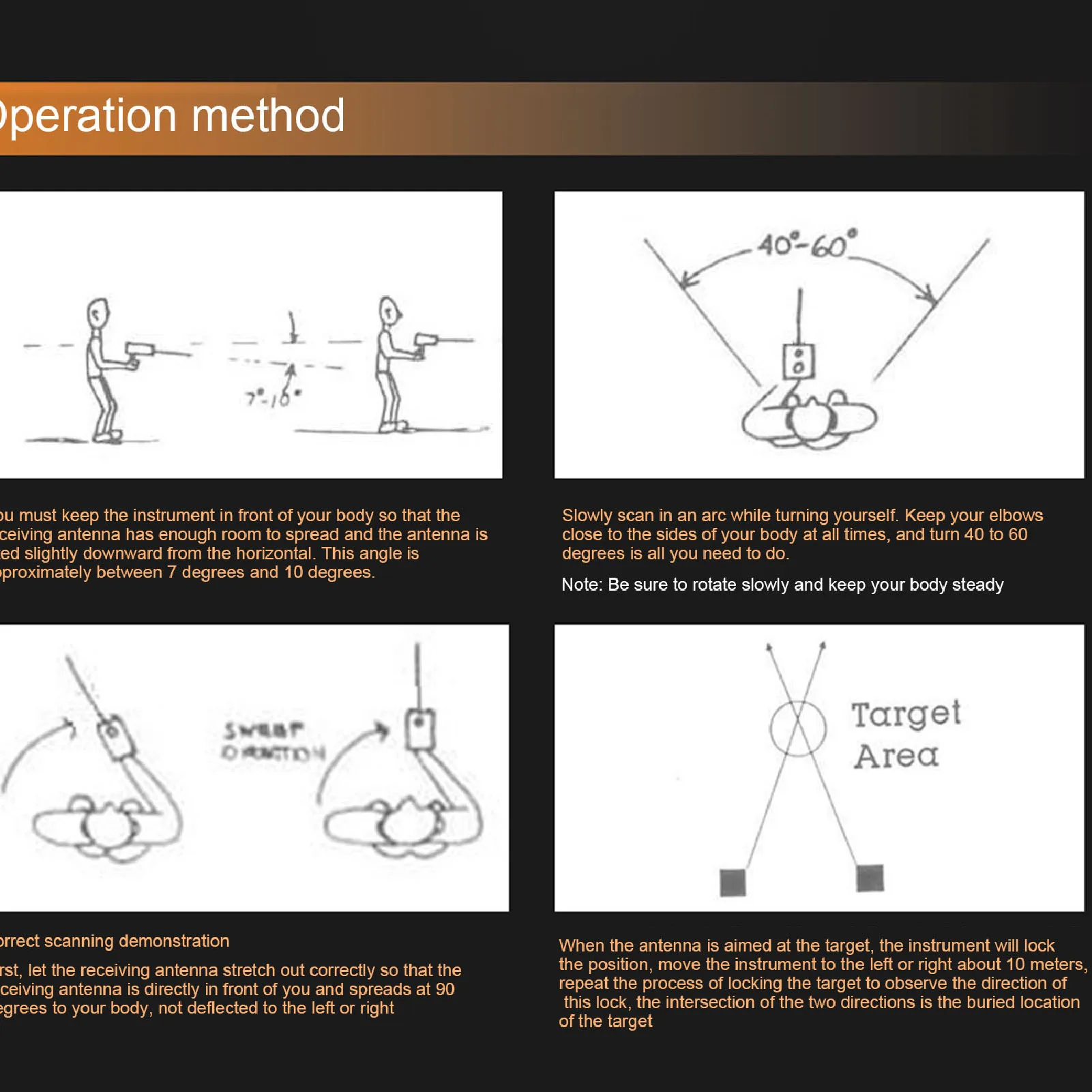 4. When the antenna is aimed at the target object, the instrument will lock, even if you step over the target and continue to detect. When you feel that this lock is effective, remember this direction. Then, move the instrument about 10 meters to the left or right and repeat the process of locking the target as mentioned earlier. Observe the locking direction this time, and the intersection of the two directions is the burial position of the target object.