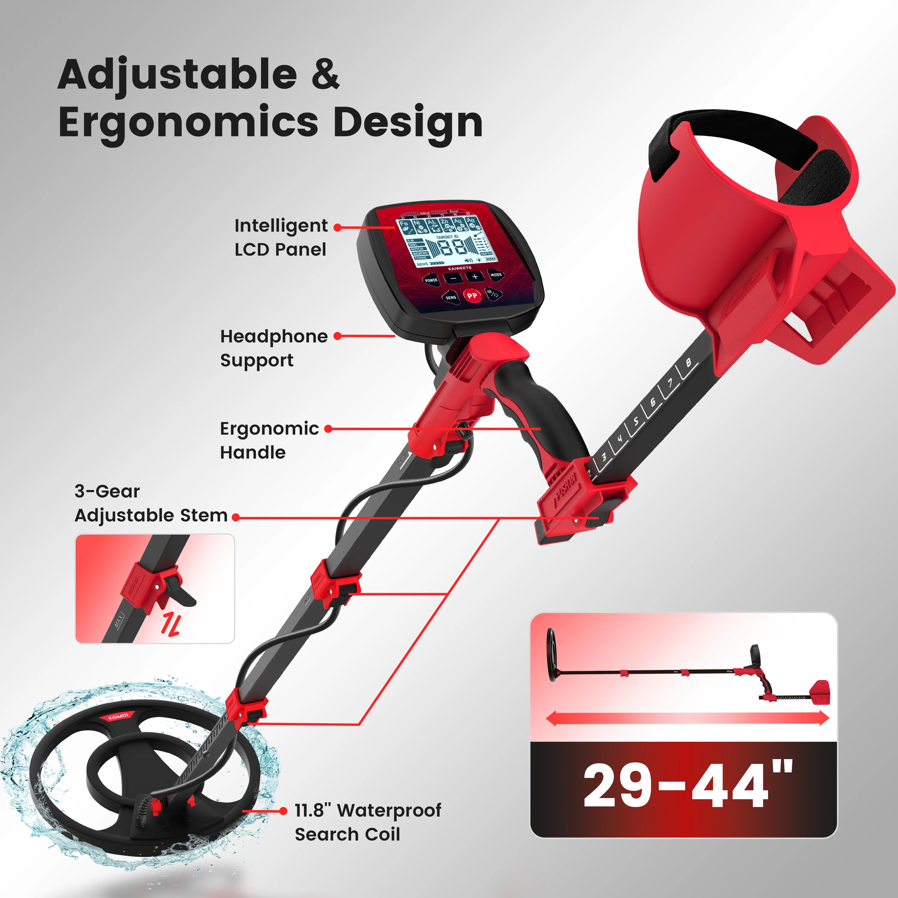 Gold detector with 5-level sensitivity, you can adjust the sensitivity to counteract some interference factors and find the target faster. Detector from 29-inch to 44-inch adjustable stem, suitable for both adults and kids. Save more effort with arm rest of the design, which makes you more comfortable with the metal detector. Foldable design for easy portability and storage, lightweight, easy to use.