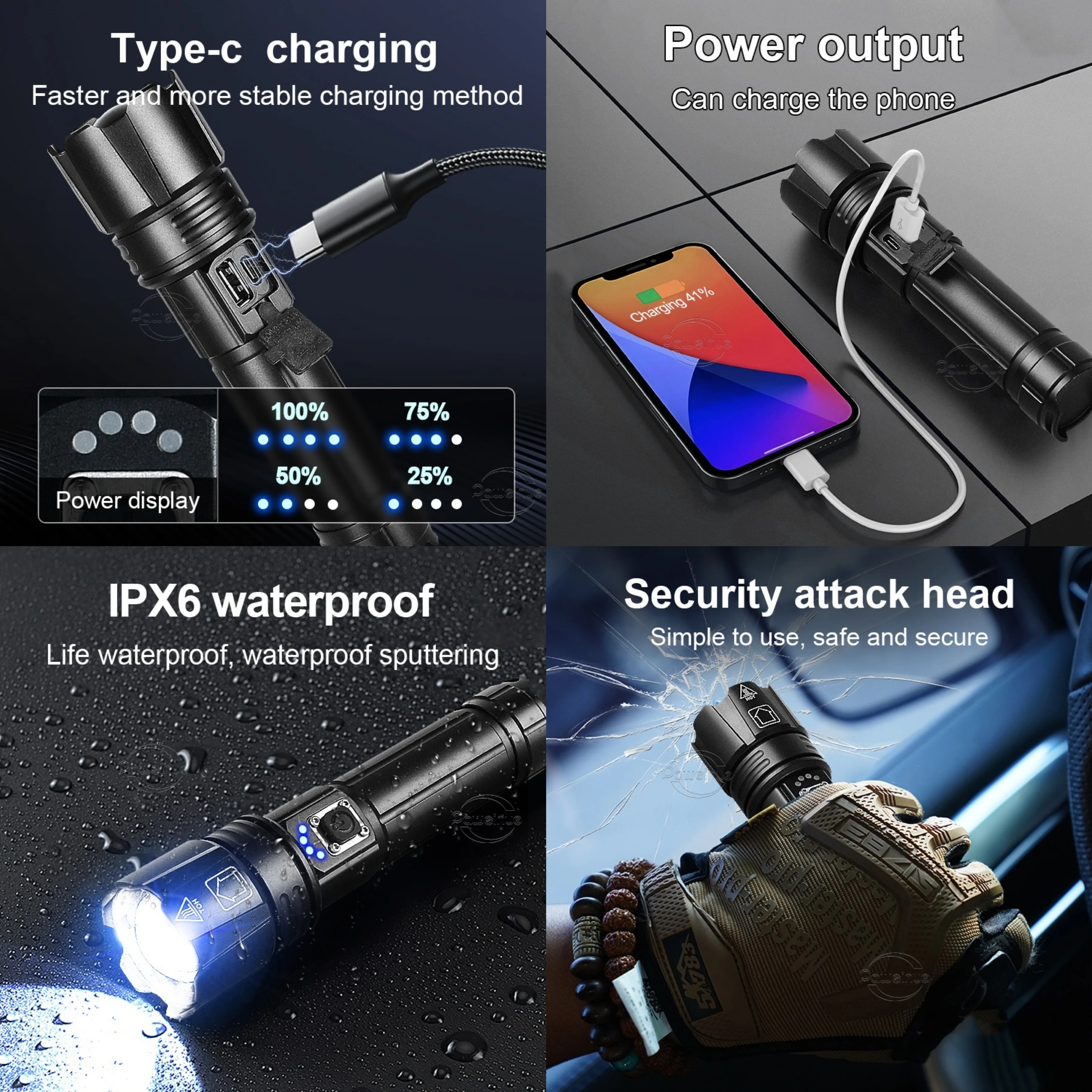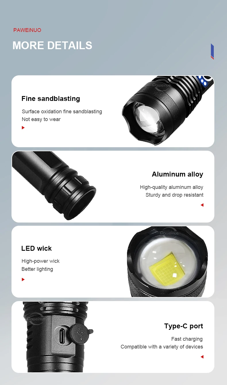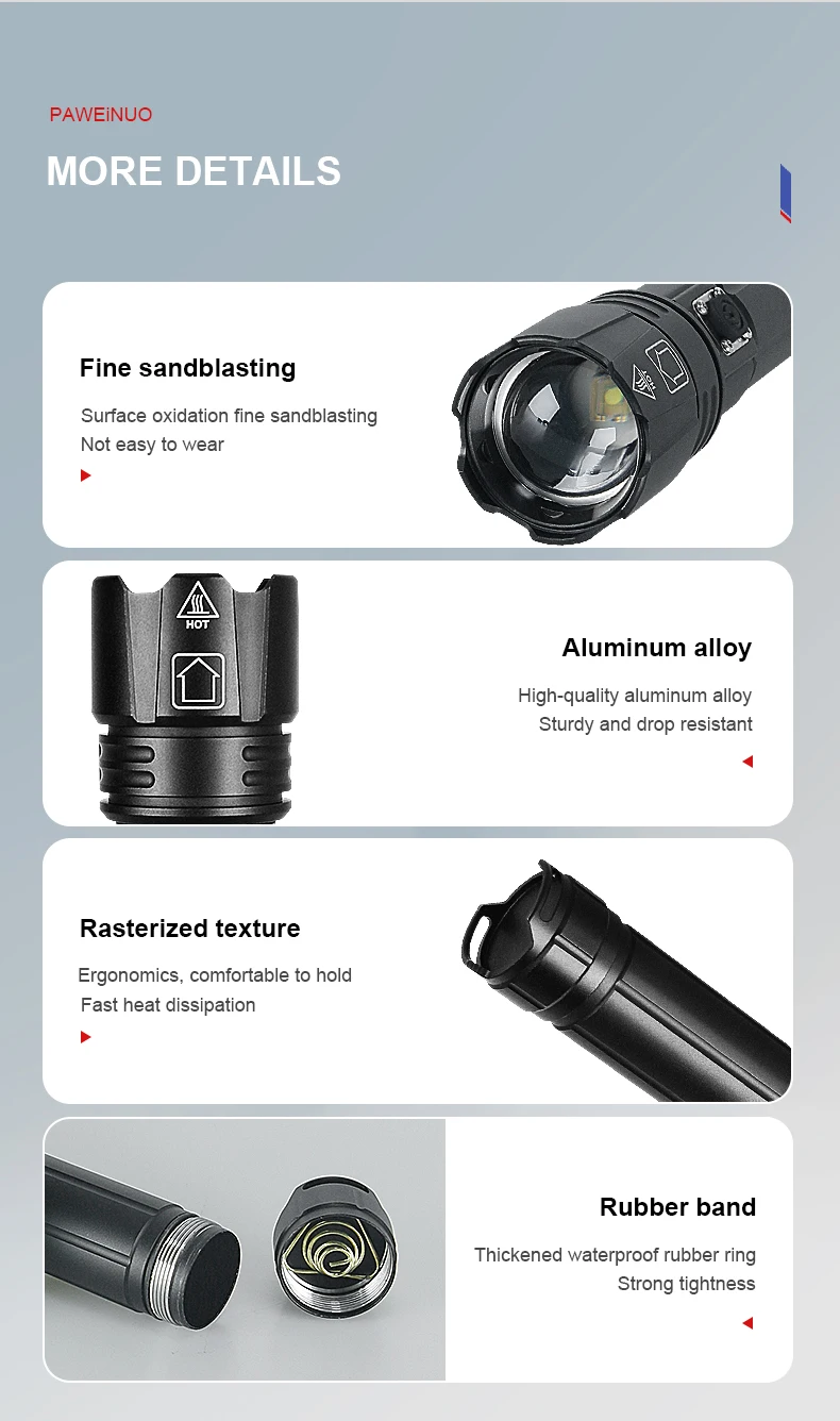 – Light Mode: 5 Modes (Strong-Medium-Low-Flash-SOS)