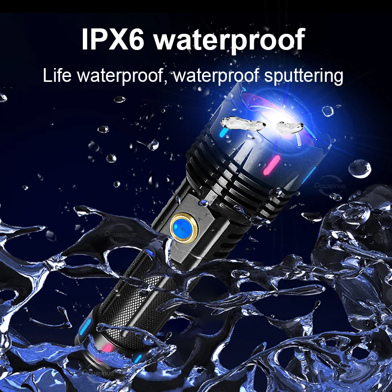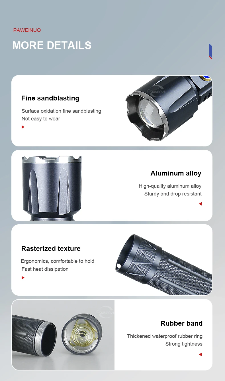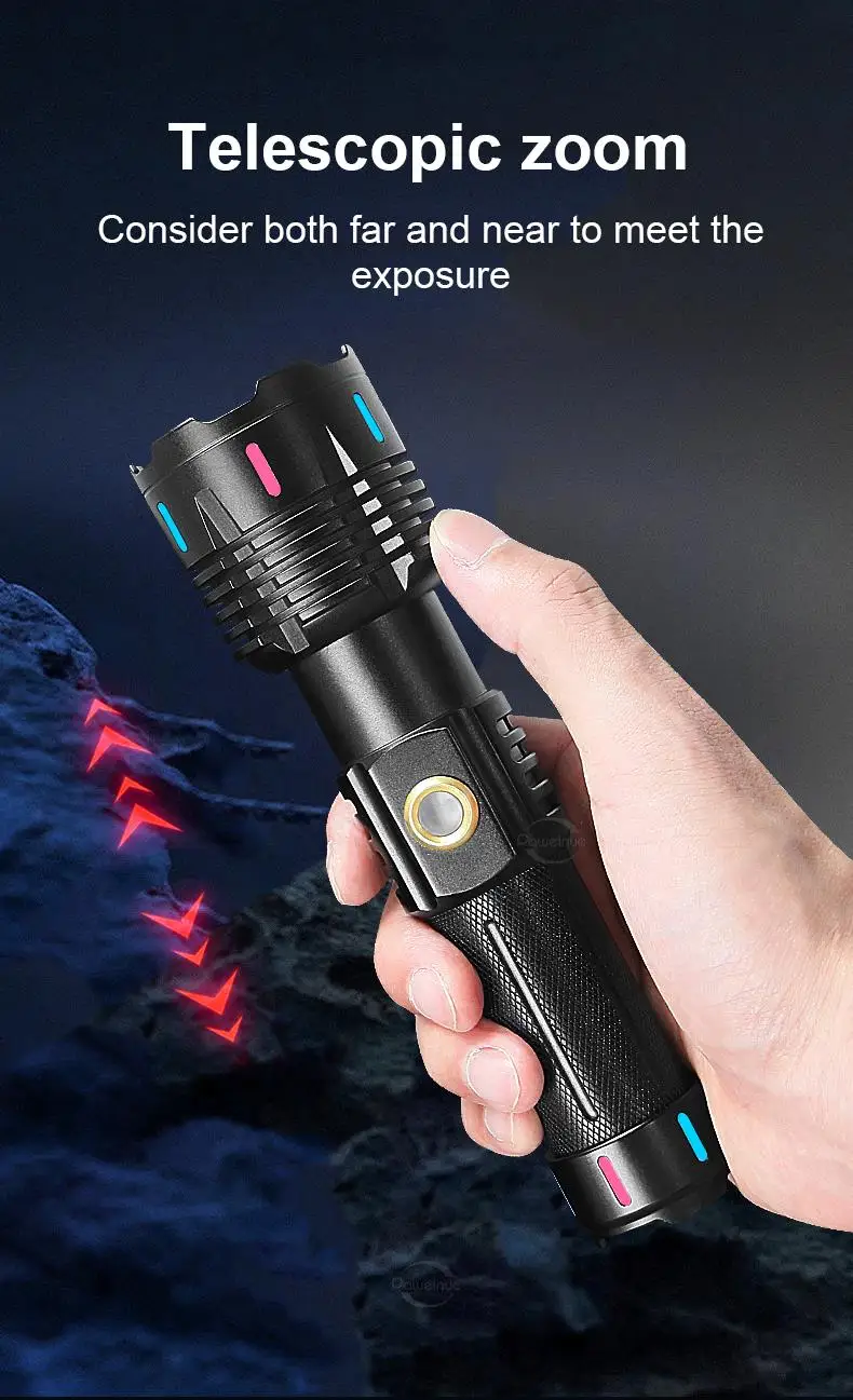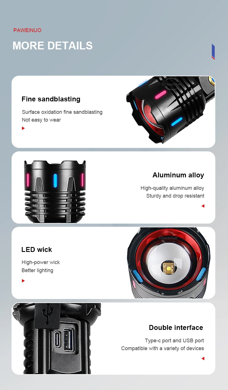 ✔ Easy to use: This flashlight has 5 modes, and long press the switch to turn off the flashlight in any mode. Use large capacity battery for longer battery life. Type-c charging, red and blue light indicator power display. You can also give the output power to charge your phone.