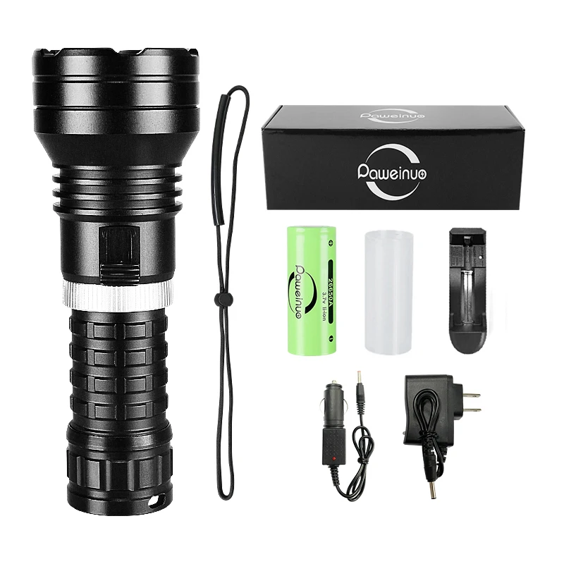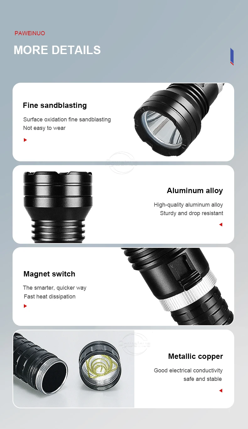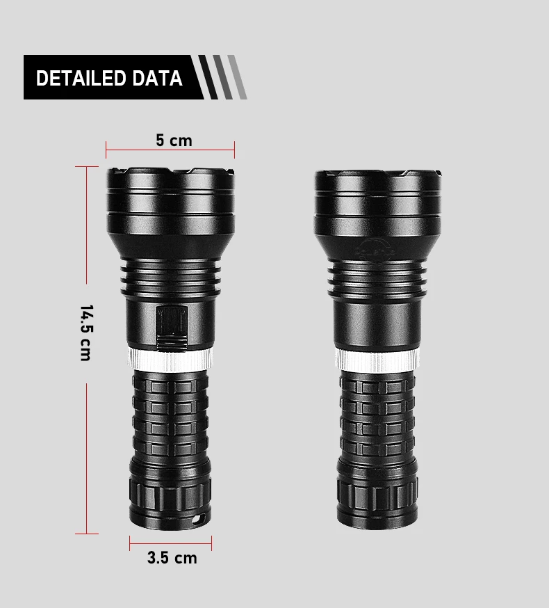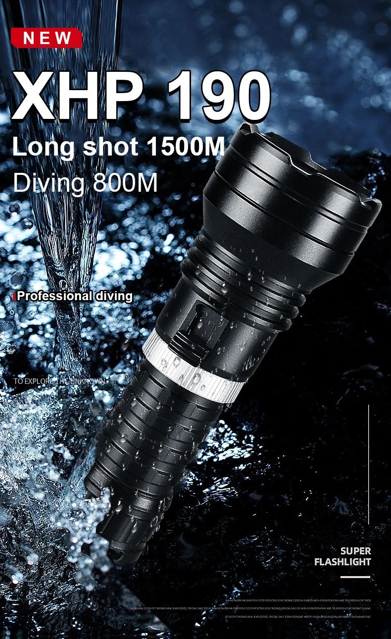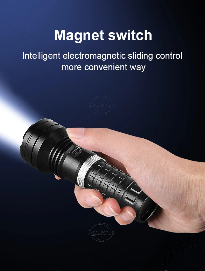 This is a newly upgraded XHP190 professional diving flashlight. It uses XHP190 LED as the light-emitting point of the flashlight. The switch is designed using the principle of magnetic induction, which perfectly solves the problem of water intrusion into the buttons of old diving flashlights and brings you an excellent diving experience. This diving flashlight is more advanced than the XHP120 diving flashlight and can reach a maximum diving depth of 800 meters. The XHP190 has very good sealing and a professional waterproof rating, allowing you to enjoy diving without worries and explore the unknown underwater world.