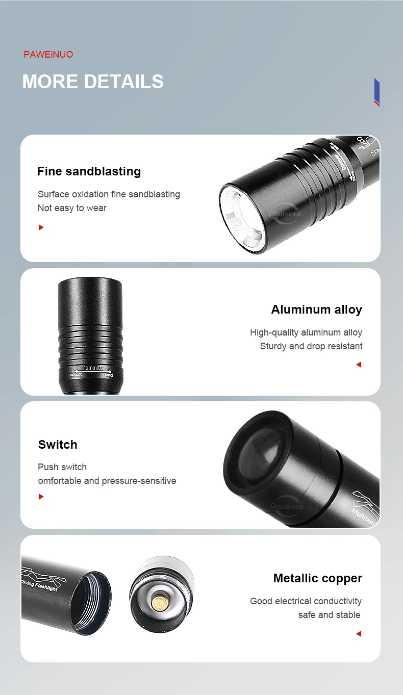 Specially designed for diving, our zoom flashlight is made of high-quality aluminum alloy, which is extremely scratch-resistant and corrosion-resistant. With wrist strap, small size, very convenient to carry. T6 LED, produces a maximum of 1000 lumens of light, and the LED life span exceeds 100,000 hours. With an adjustable focus range, zoom in for an intense beam of light, or zoom out for broader illumination, perfecting your underwater tour.