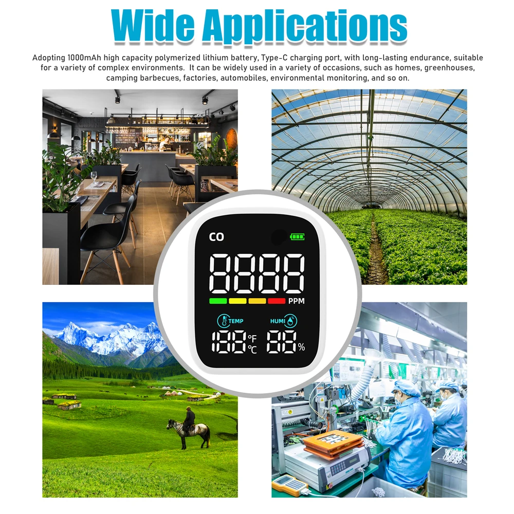 【CO Concentration & Temperature & Humidity Measurement】: Built-in nice-performance electrochemical NDIR CO detection chip, real-time monitoring of CO concentration, to ensure obtained accurate data easily in harsh environments. High sensitivity, ultra-low power consumption, fast computing speed, and accurate data. Built-in high-precise temperature and humidity sensors can sensitively detect temperature and humidity data at the same time, the detection results are more accurate.