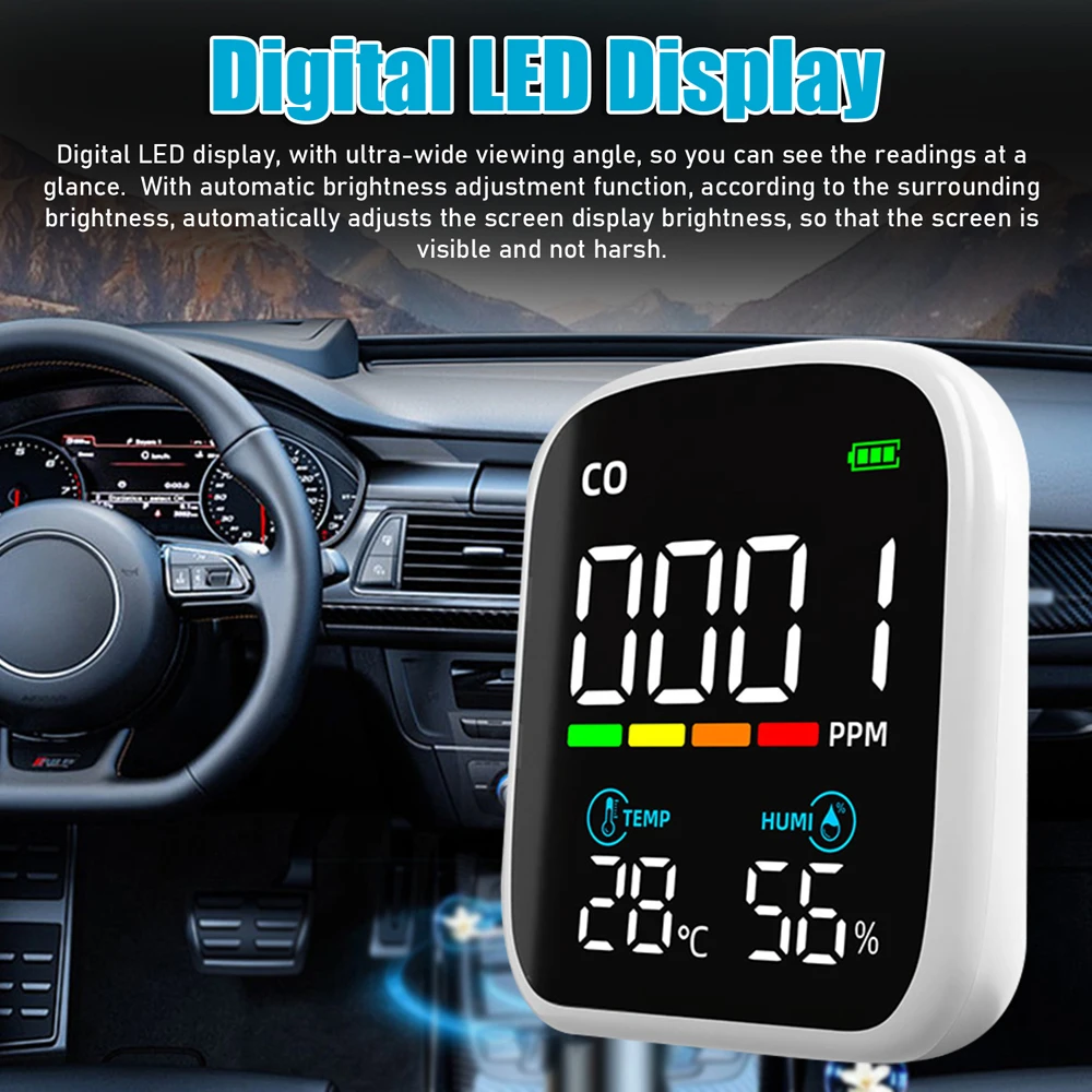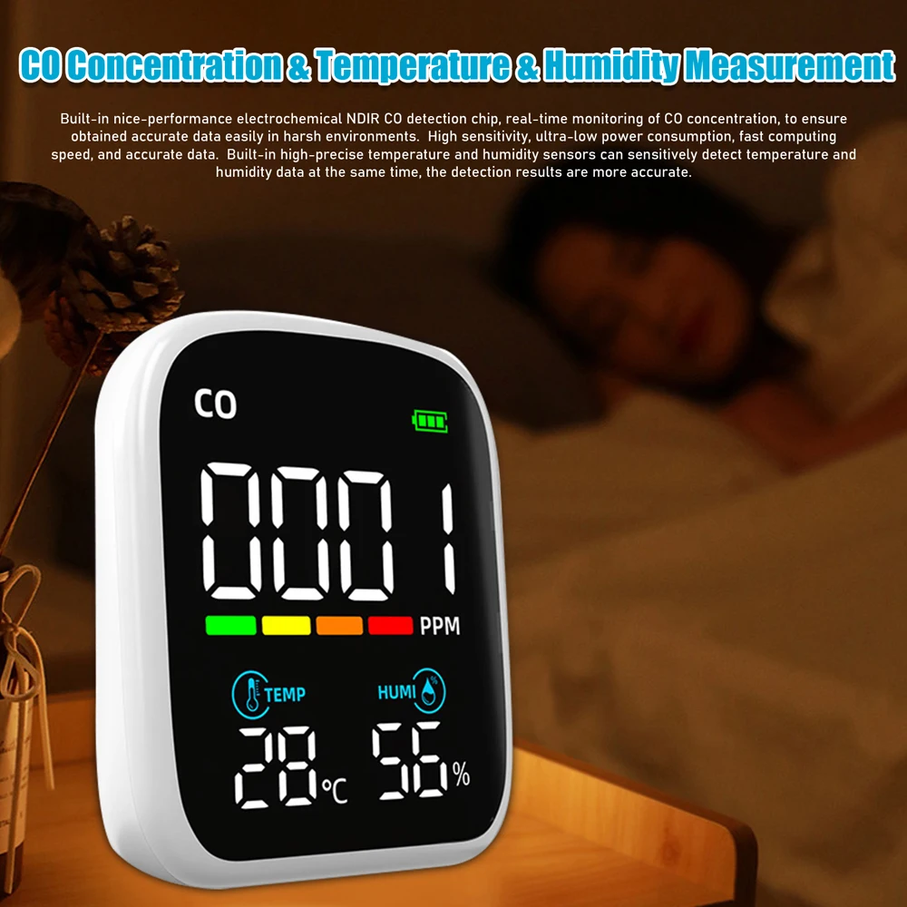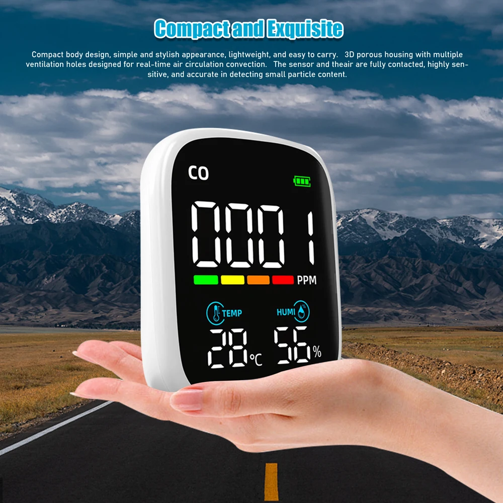 This portable air quality monitor adopts an electrochemical NDIR sensor and a high-precise temperature and humidity sensor, with stable performance and high detection accuracy, supporting real-time monitoring of CO concentration, temperature, and relative humidity in the air. Digital LED display, with ultra-wide viewing angle, so you can see the readings at a glance. 3D porous housing with multiple ventilation holes designed for real-time air circulation convection. The sensor and theair are fully contacted, highly sensitive, and accurate in detecting small particle content. It can be widely used on a variety of occasions.