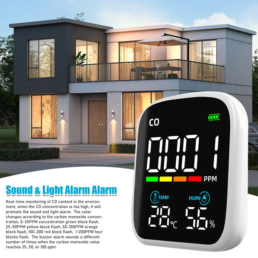 【Sound & Light Alarm】: Real-time monitoring of CO content in the environment, when the CO concentration is too high, it will promote the sound and light alarm. The color changes according to the carbon monoxide concentration, 0-25PPM concentration green block flash, 25-50PPM yellow block flash, 50-100PPM orange block flash, 100-200PPM red block flash, ≥200PPM four blocks flash. The buzzer alarm sounds a different number of times when the carbon monoxide value reaches 25, 50, or 100 ppm.