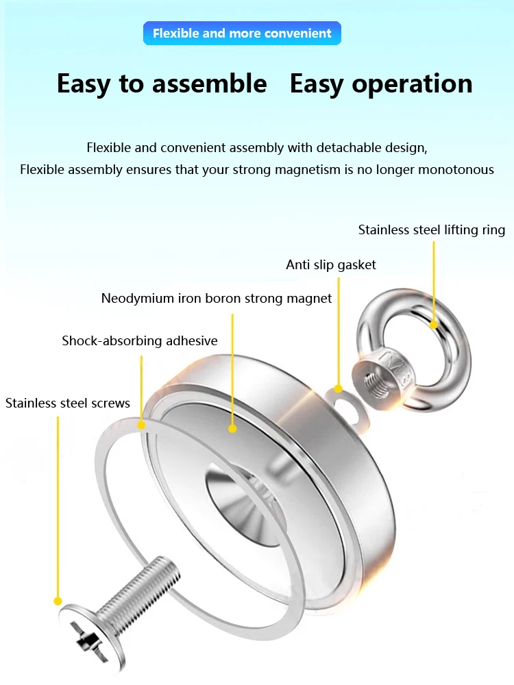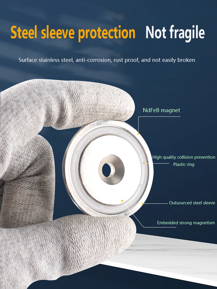 The product consists of two parts (A3 iron shell+neodymium iron boron strong magnetic), and the countersunk hole design can be used with corresponding models of countersunk screws.