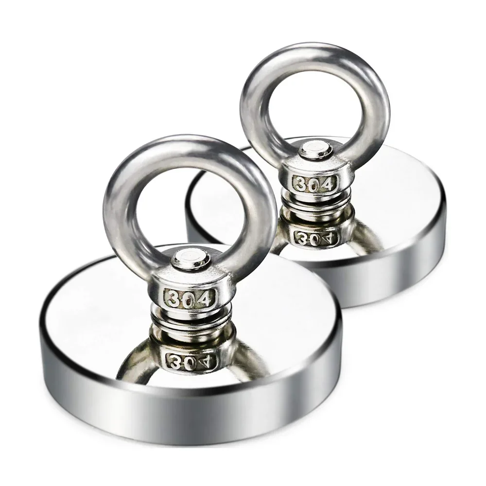 Super Strong Neodymium Fishing Magnet Hook N52 Heavy Duty Rare Earth Magnet with Countersunk Hole Eyebolt 16-90mm Salvage Magnet About this product SUPER POWERFUL – This magnets is 16/20/25/32/36/42/48/60/75/90 mm in diameter, adopt strong neodymium magnet for its base. It can offer 10/19/41/70/90/134/165/265/551/772LBS pulling strength under ideal condition. About this item SUPER POWERFUL – This fishing magnets adopt strong neodymium magnet for its base. HIGH QUALITY – The powerful magnetic force is only concentrated at the bottom, The other three sides are Protected by steel cups that almost no magnetic force and magnetic force equivalent to 10 times the volume of the same magnet. force permanent, long service life. Made under ISO 9001 Quality Systems. BEST COATING – Ni+Cu+Ni Triple Layer Coated. The Best Coating Available, which Provides a Shiny and Rust Resistant Coated steel cup provides protection for the magnet and helps to prevent chipping or cracking. MULTI USE – Unique design with Countersunk Hole and Eyebolt Great for salvaged of various iron-containning nickel material underwater and Good idea for magnet fishing, lifting, hanging, retrieving applications. Have fun to searching items like eyebolt, screws, hooks, fasteners and so on in your warehouse garage or yard. PERMANENT STRENGTH – Neodymium is a kind of rare earth metal, it's suitable for making permanent & powerful magnets. This fishing magnet has permanent magnetism, it will be the same powerful even decades after. specification: 1. Shape: round 2. Material: NdFeB magnet + A3 steel + 304 stainless steel 3. Color: silver 4. Maximum vertical tension J16mm: 4KG/10LBS J20mm: 9KG/19LBS J25mm: 19KG/41LBS J32mm: 32KG/70LBS J36mm: 41KG/90LBS J42mm: 61KG/134LBS J48mm: 75KG/165LBS J60mm: 120KG/265LBS J75mm: 250KG/551LBS J90mm: 350KG/772LBS