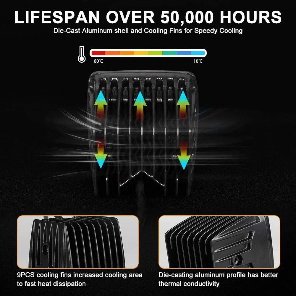 ●The 10 cooling fin on the back of the LED driving lights to dissipate the temperature into the surrounding air.