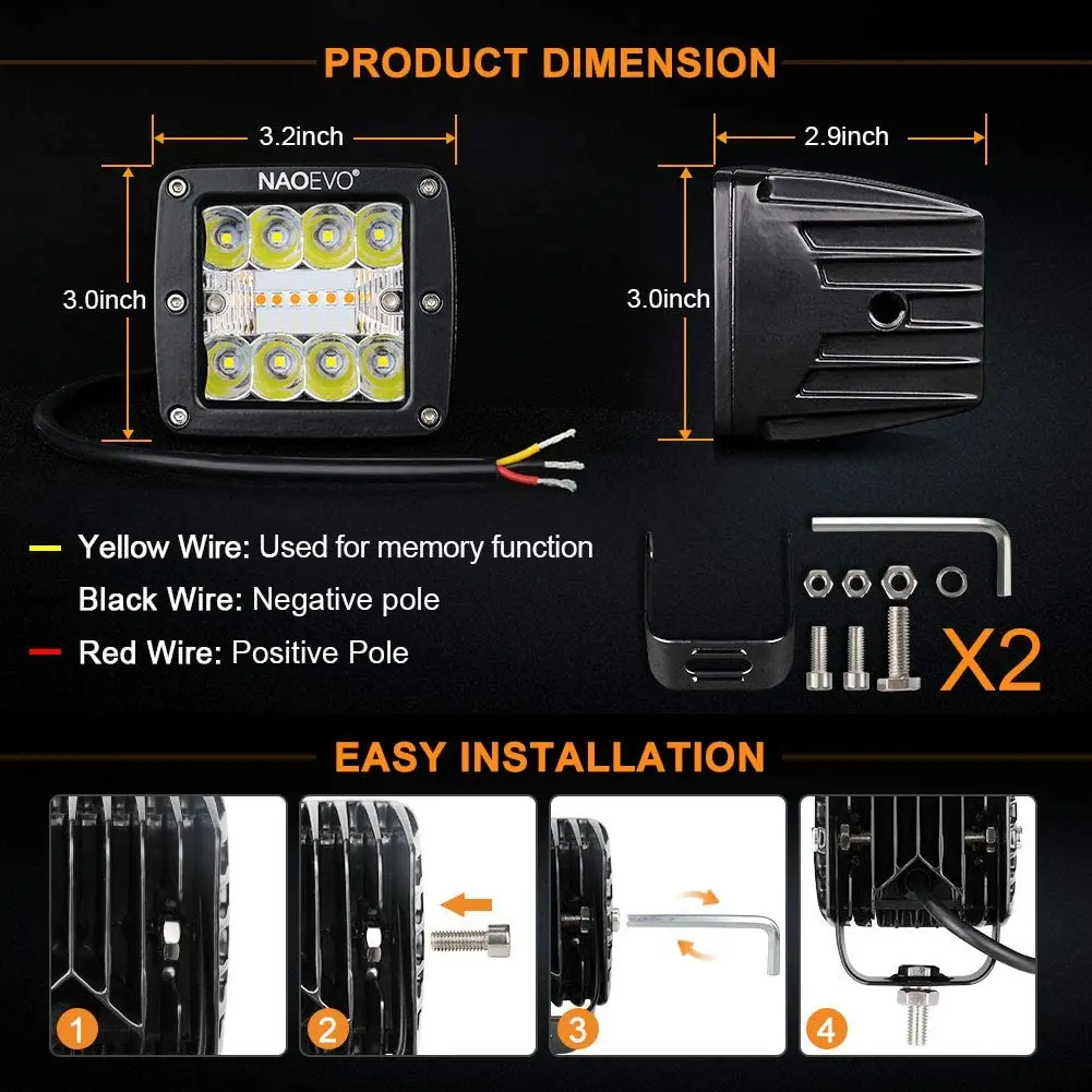 Amber White Strobe Flashing 6 Lightting Modes 3 Inch 72W 12V 24V Led Work Light Bar 2 Pieces