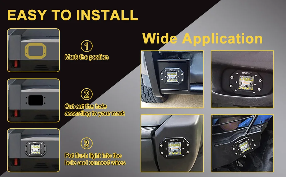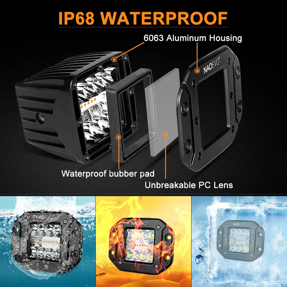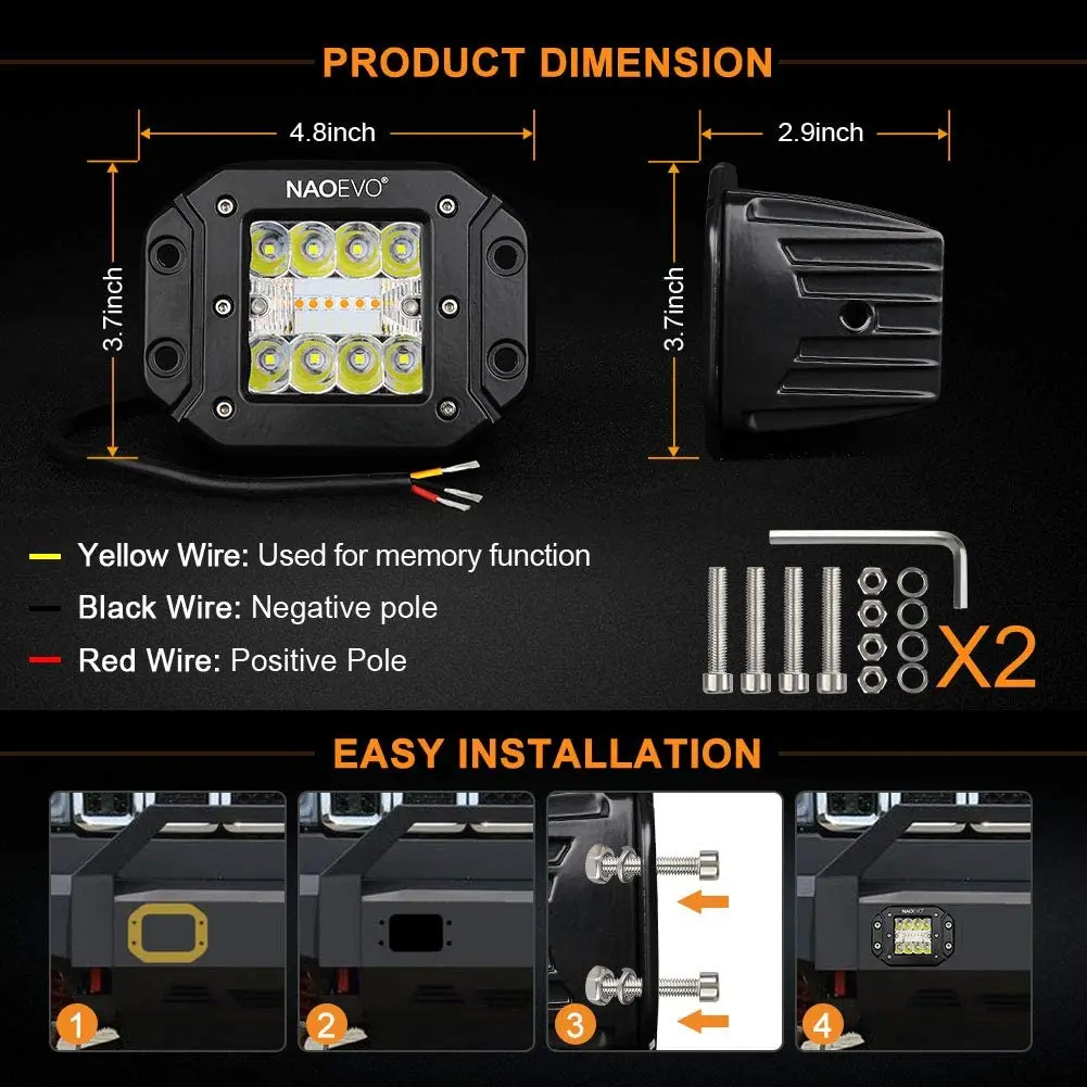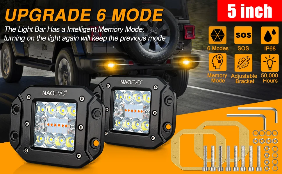 Be the first to review “NAOEVO Flush Mount Offroad Led Light Bar Pod 5Inch 72W 12V 24V Amber White Fog Drive Rear LED Work Lamp For Auto Truck Jeep SUV”