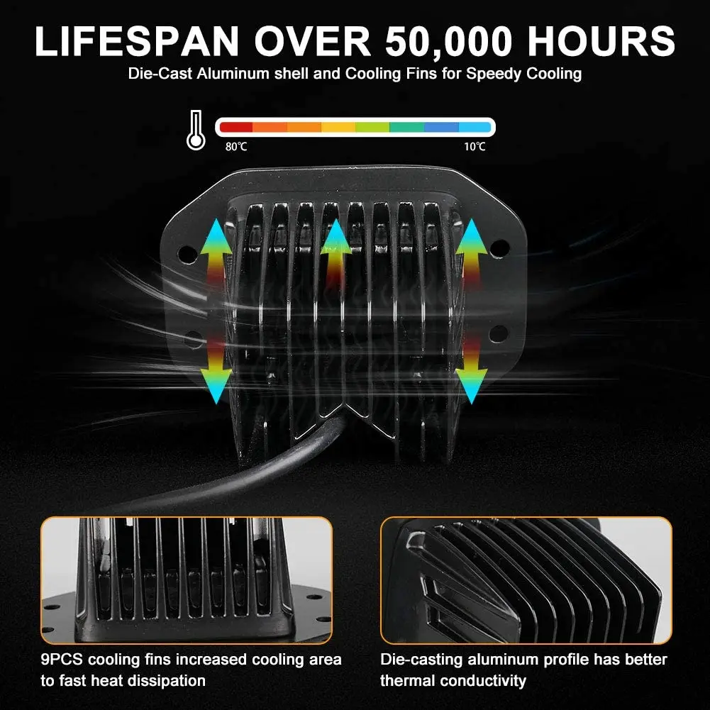 ●The 10 cooling fin on the back of the LED driving lights to dissipate the temperature into the surrounding air.