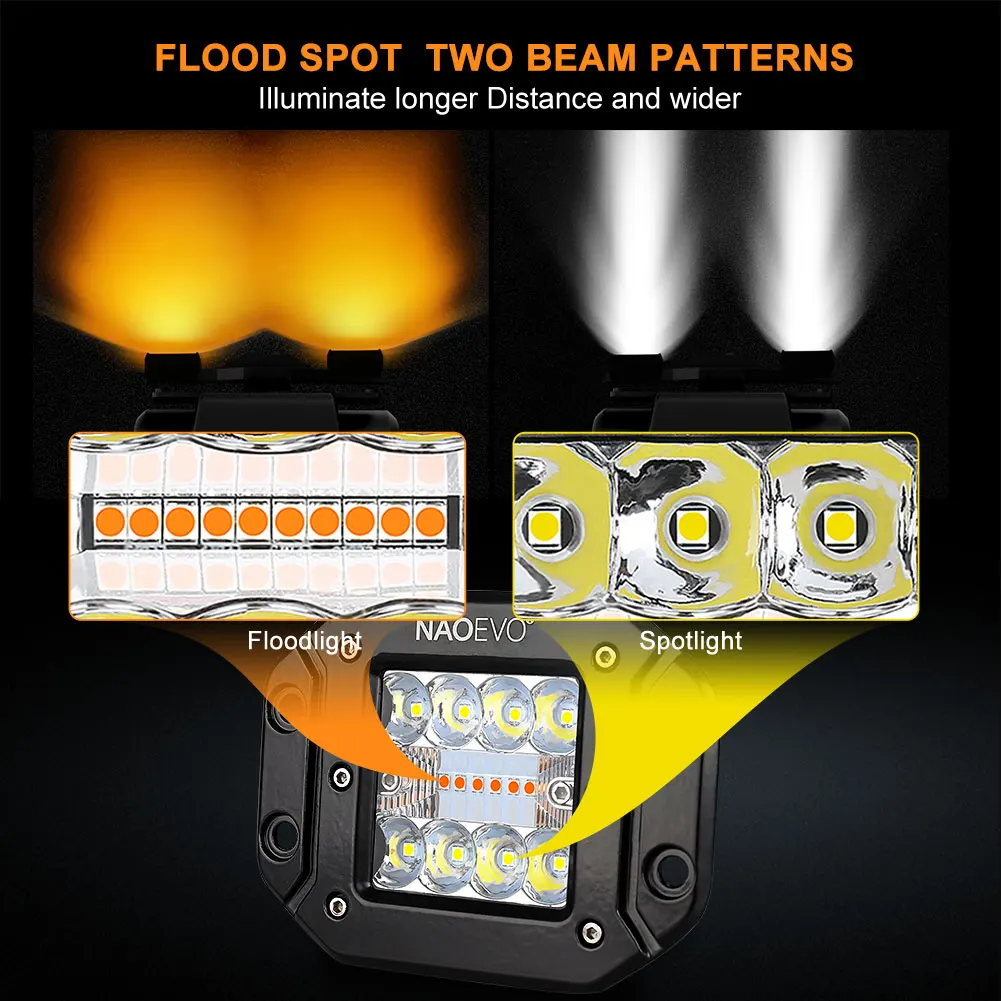 NAOEVO Flush Mount Offroad Led Light Bar Pod 5Inch 72W 12V 24V Amber White Fog Drive Rear LED Work Lamp For Auto Truck Jeep SUV