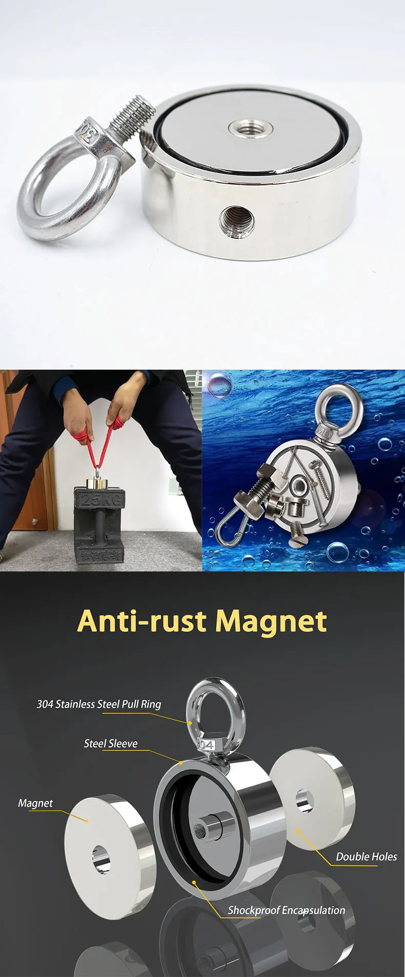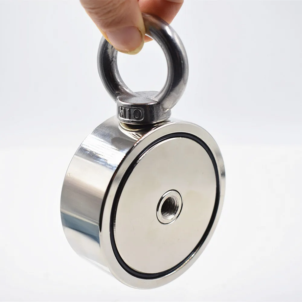 This neodymium fishing magnet /salvage magnet is mainly made up of a high grade neodymium magnet and a steel shell, the steel shell is crucial to amplification of magnetic force, it concentrates the powerful magnetic field on the bottom of magnet which increase the magnetic force by 2.5-4 times compared to the naked magnet. At the same time, the steel cup can prevent the naked magnet from scratch and chipping during grabbing and clamping.It is designed for heavy duty and underwater use. It can help to recover lost equipment, tools, fishing tackles and other objects in deep water, wells, holes. It is also great for magnet fishing, lifting, hanging and retrieving applications.