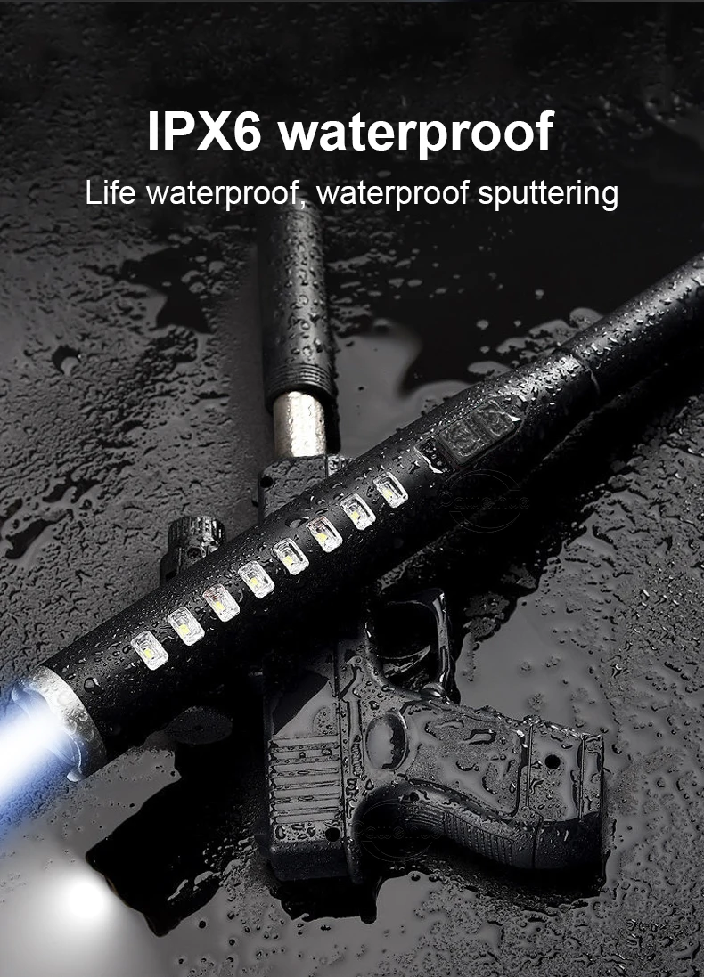 IPX6 waterproof and dustproof, so that the flashlight can normally illuminate in bad weather such as cloudy and rainy days, but please note that it cannot be used for underwater lighting.
