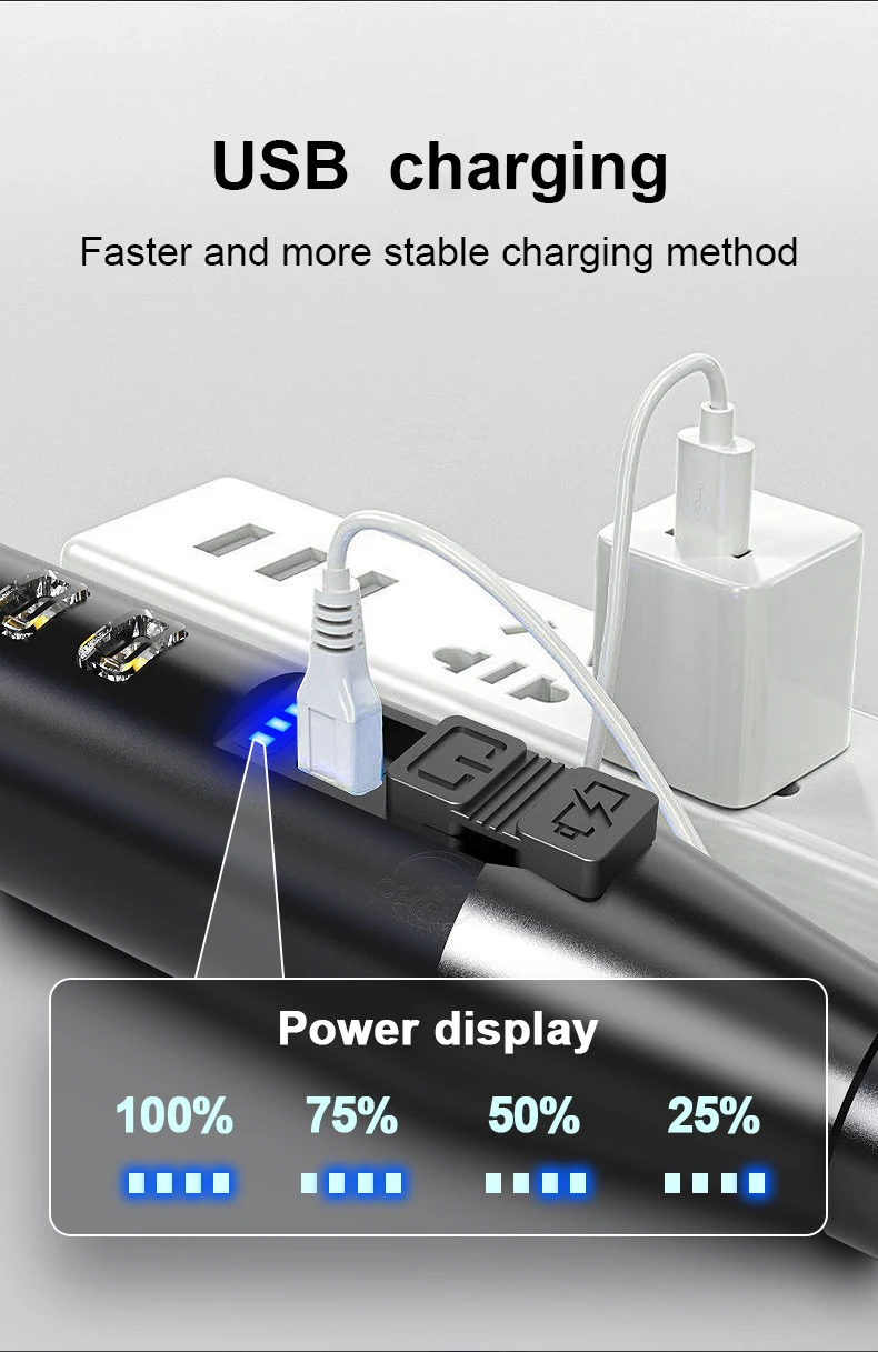 Usb charging, equipped with intelligent overcharge protection to prolong battery life; 4-level power indicator light, the power consumption situation is clear at a glance, please charge it in time when the power is 25%.