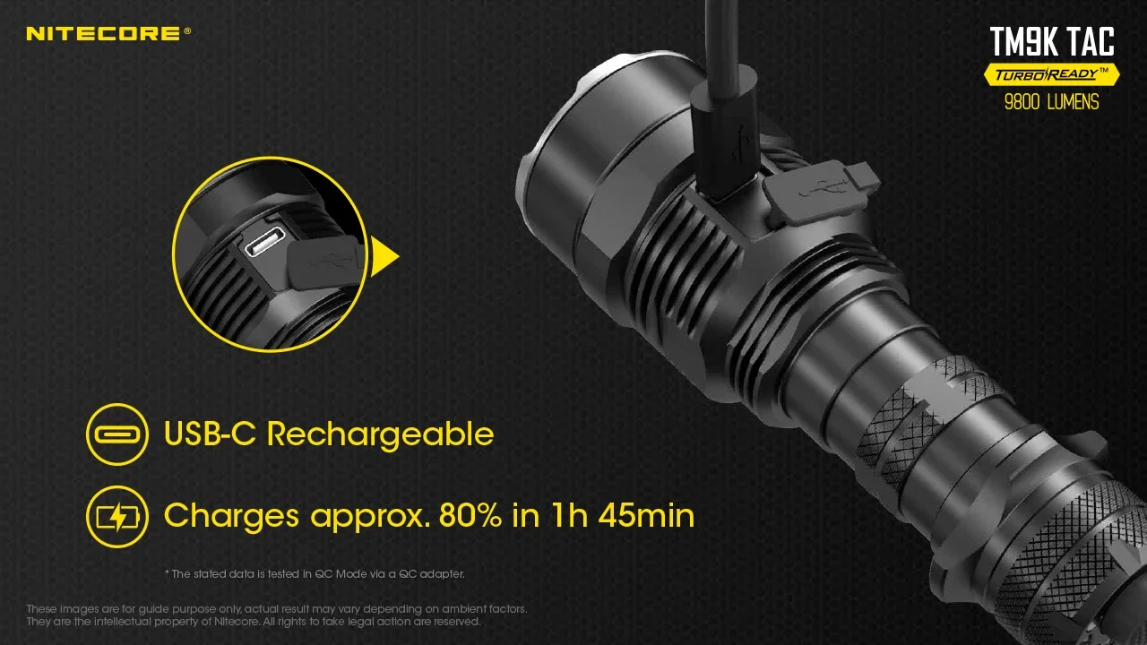 The Nitecore TM9K-TAC comes with a built-in USB-C charging port that directly recharges the built-in 21700 battery pack. With power flowing through the built-in port it's possible to bring the TM9K-TAC back to 80% charge in less than 2 hours! Now, you can get back out in the field ASAP.