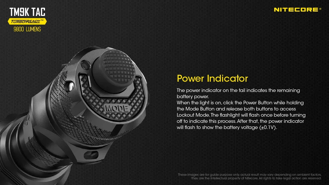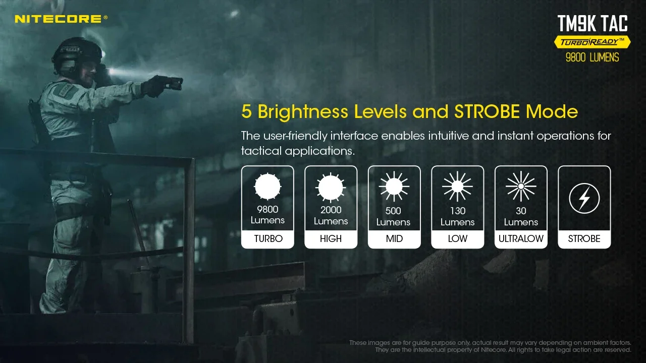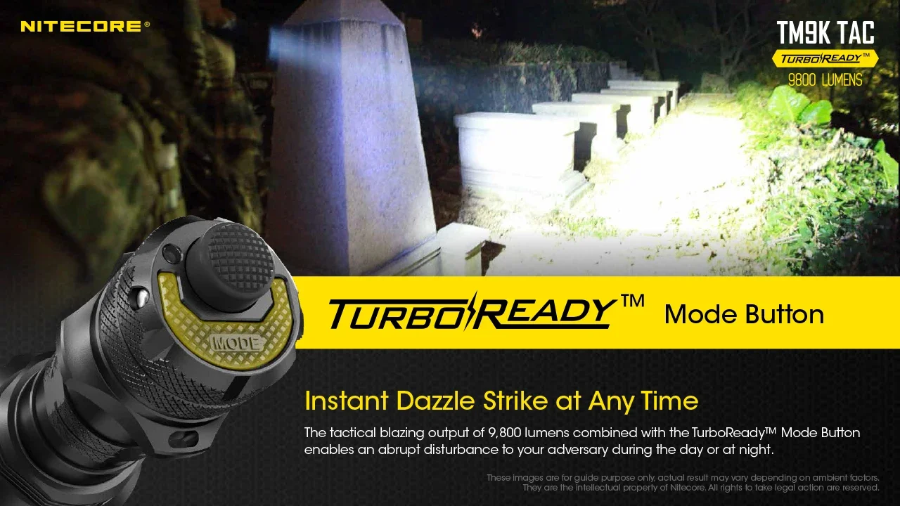 Compared to the original TM9K, the TM9K-TAC now has a 9800 lumen turbo mode. This increased output is instantly accessible with the TurboReady mode button. Plus, the increased throw, now 280 meters, is great for long-range targeting that's a necessity with tactical applications like for law enforcement or search and rescue.