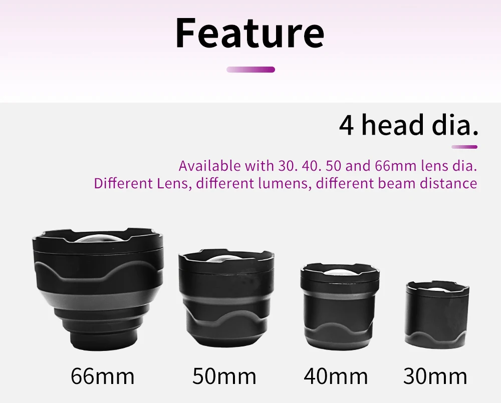 Available head dia. : 30mm,50mm, 66mm. Different Lens, different lumens, different beam distance.