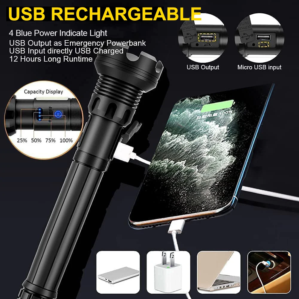*The flashlight can get full charged via any USB port. What's more, our LED flashlight has the power output function, so you can use it as a power bank to charge your devices, no need to worry about power running out when traveling outdoors. Our rechargeable led flashlight adds power display function, so that you can see the remaining battery at a glance.