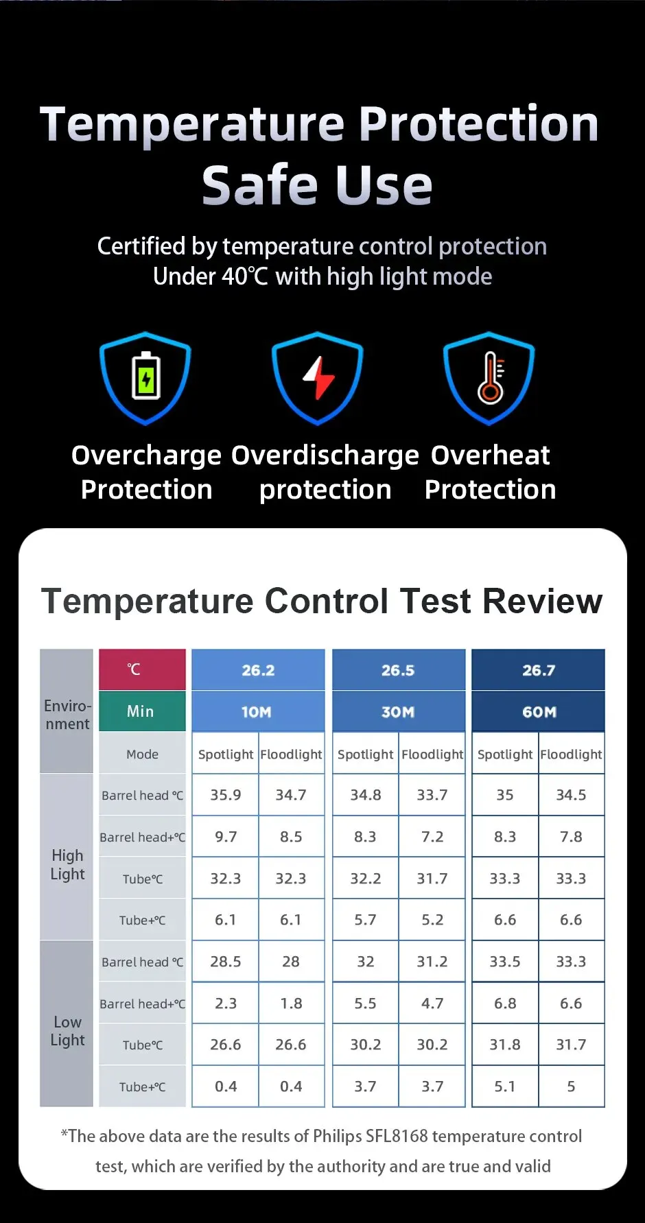 Certified by temperature control protection Under 40℃ with high light mode