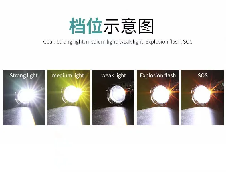 Gear settings: strong light, medium light, low light, strobe, SOS