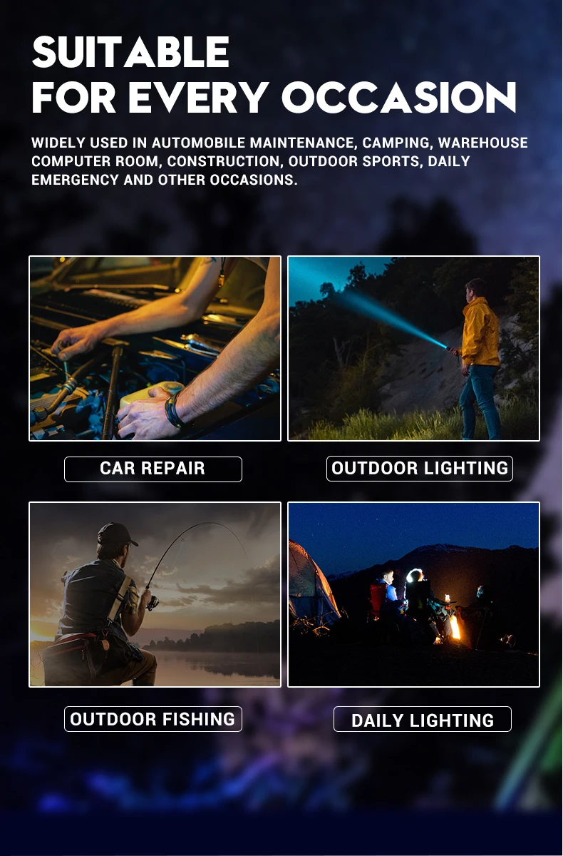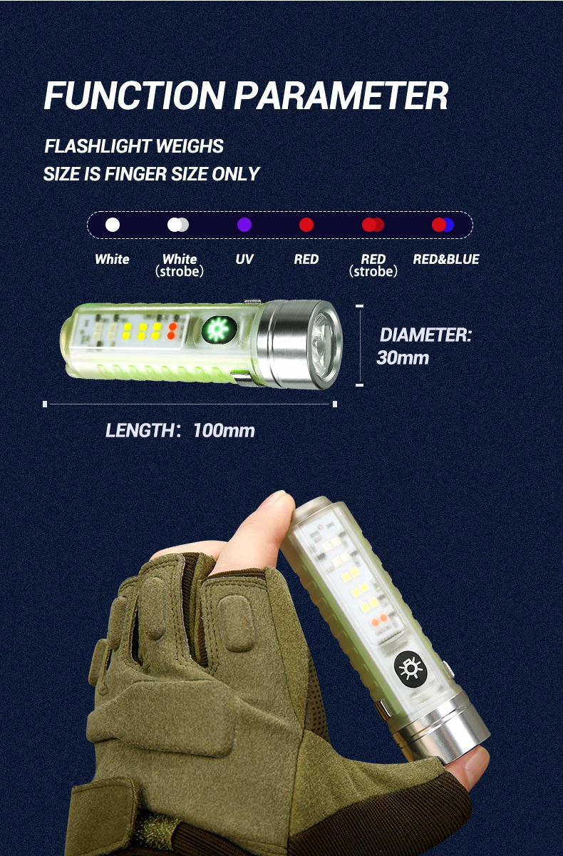 Function: (UV) (Hard Light) (Laser Pointer) Applicable environment: diving, hiking, camping, self-defence, search, hunting, daily carrying, night riding, cave exploration, night fishing, patrolling