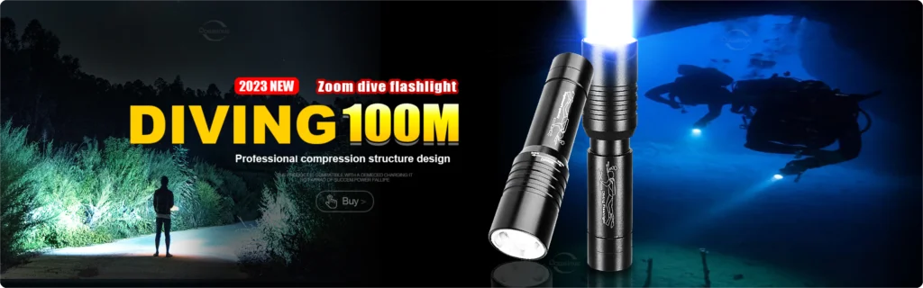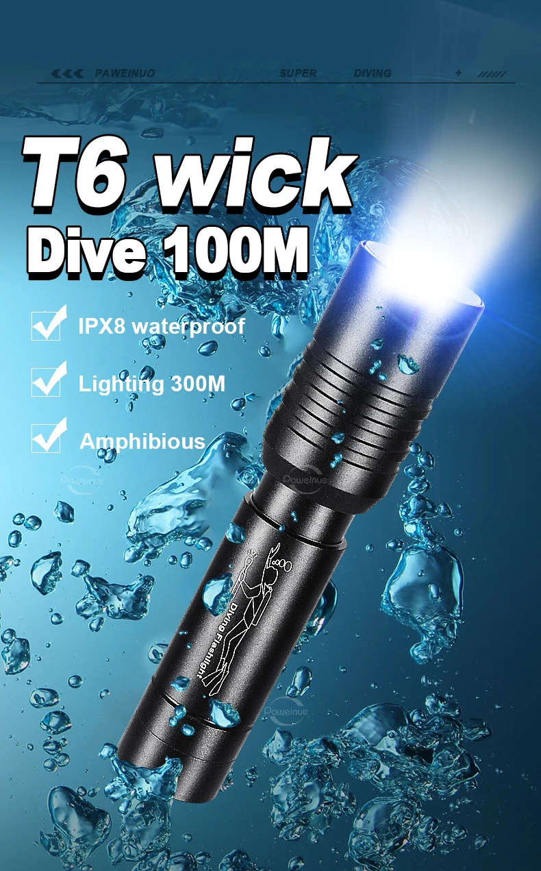 🔦The T6 diving flashlight meets the IPX8 waterproof rating and can be used underwater up to 100 meters. It has passed strict waterproof tests to ensure that it always maintains excellent waterproof performance during diving activities. You can use it for deep diving and underwater exploration with clear and bright lighting effects.