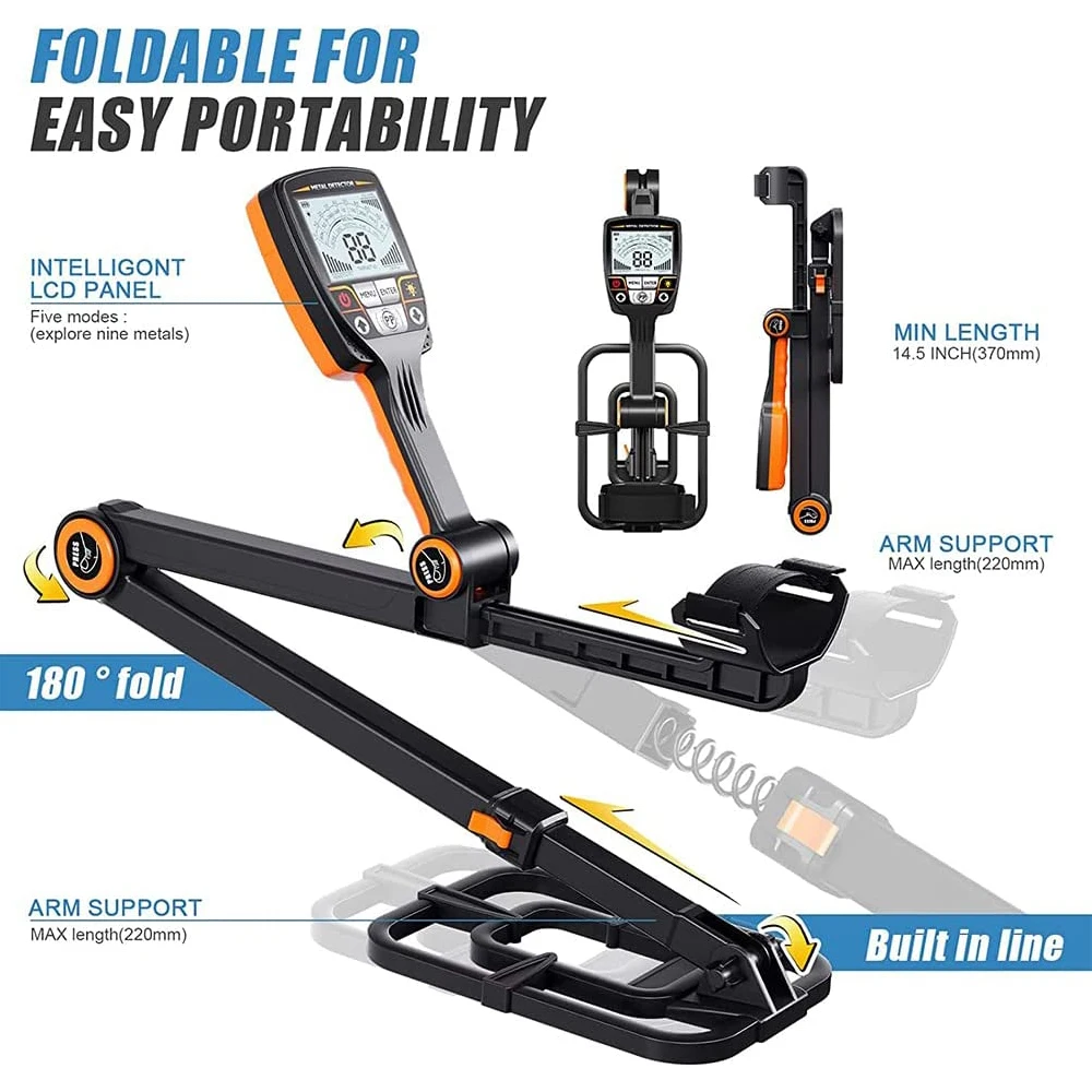 There is no complicated assembly for you, just hold the PRESS button to unfold the detector to use it immediately. Similarly, when you need to fold it, PRESS button will help you do that. (The foldable metal detector has 5 retractable places)