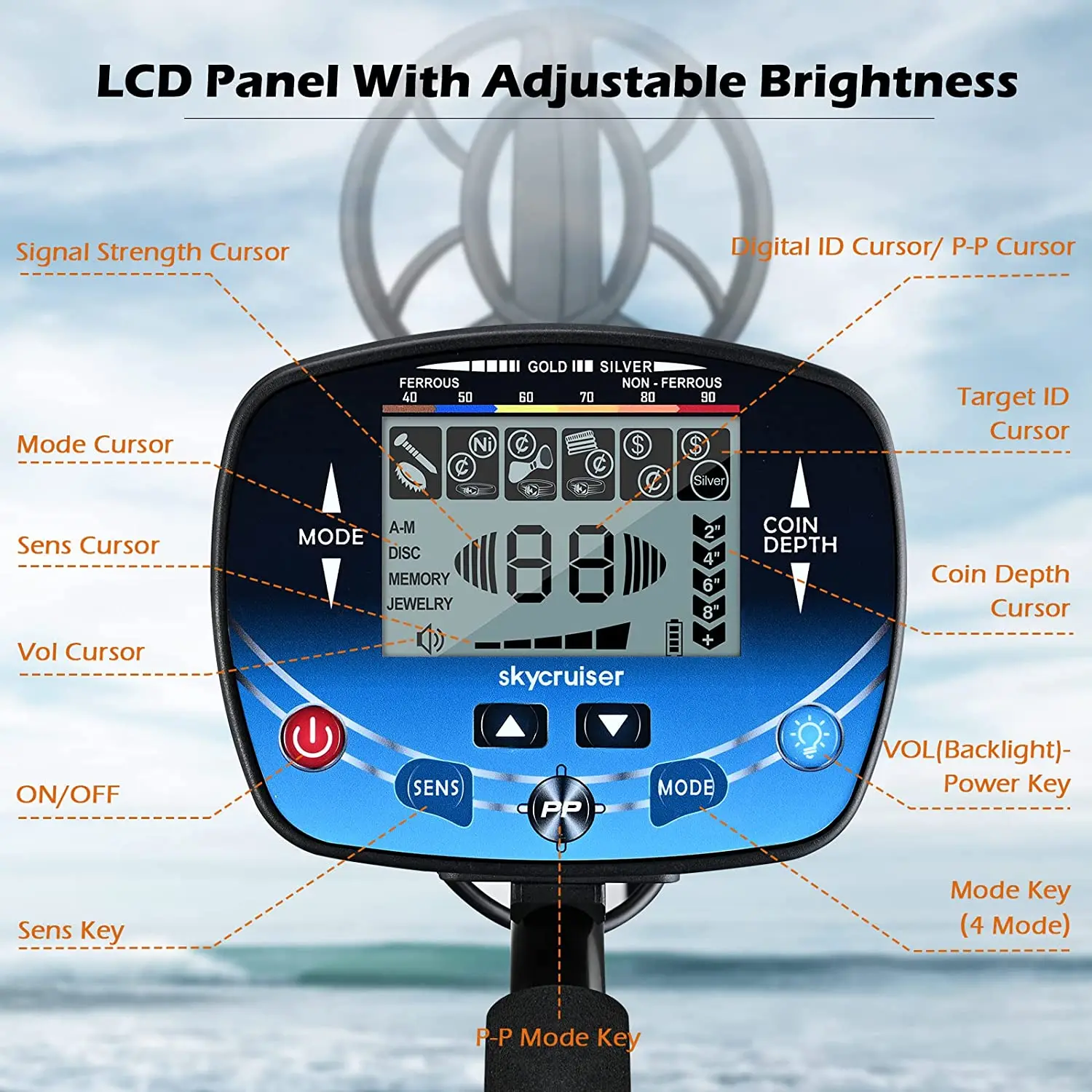 【Intuitive LCD Control Panel & Backlight Display】: This gold detector machine with larger screen to get more information, taking more fun to your exploration, back-lit LCD screen to display different detecting depth, discrimination, operating mode, tracking ID, sensitivity level, and battery level. The backlight allows you to work in the dark and gain greater flexibility.