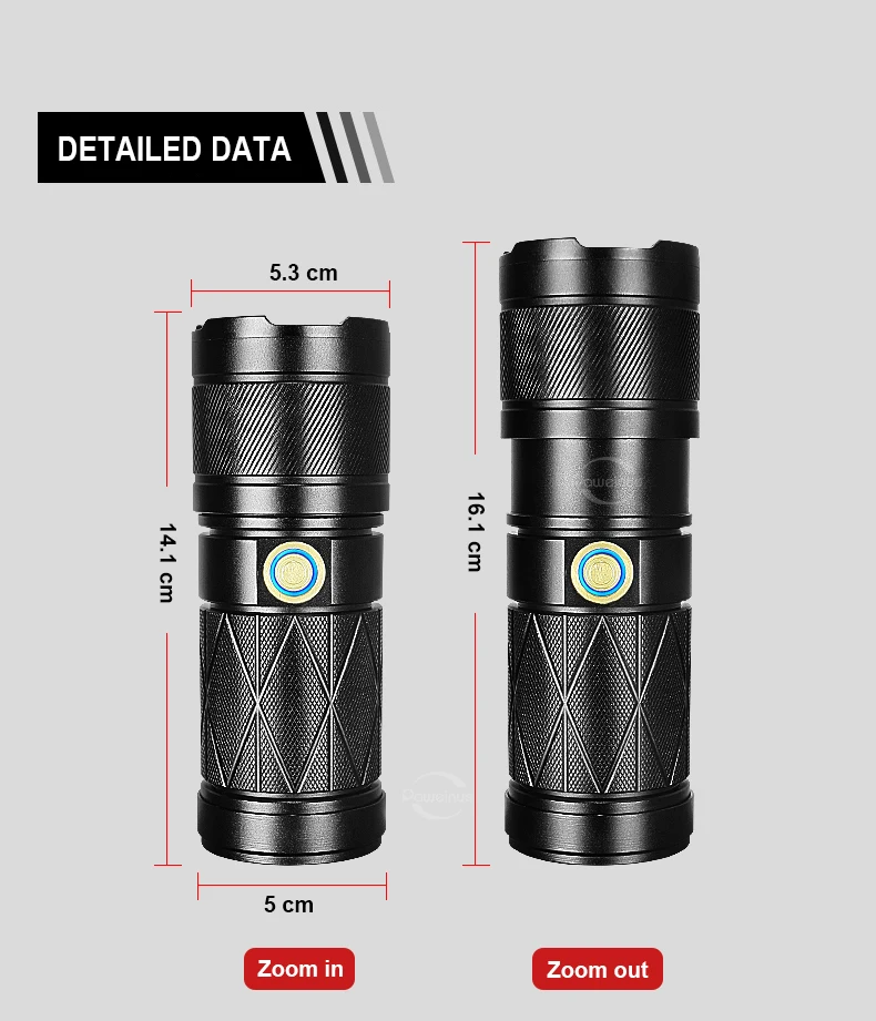 There are five lighting modes: strongest – medium – weakest – flash – SOS. For the convenience of switching the flashlight. The switch is a protruding switch. Long press the switch to turn off the light.