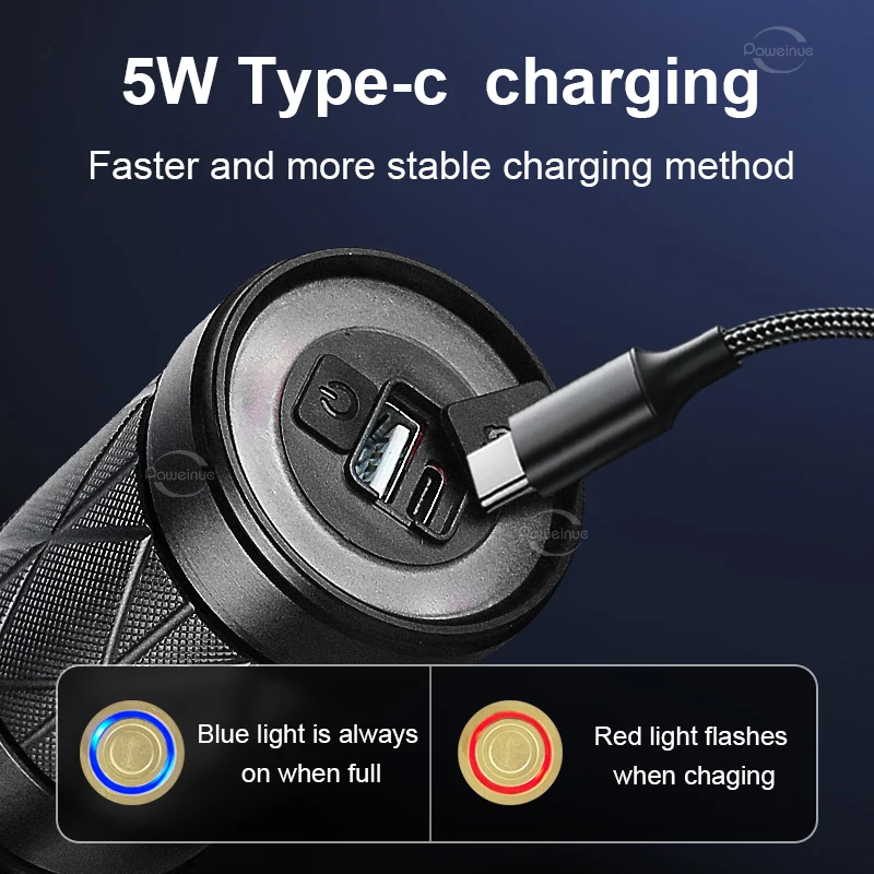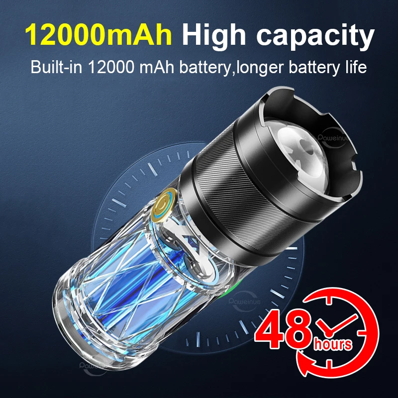 2. The flashlight adopts a large-capacity built-in battery design of 12000mAh. Effectively reduce battery consumption and improve the use time of the flashlight and the service life of the flashlight. The flashlight can be used for up to 48 hours on a full charge.