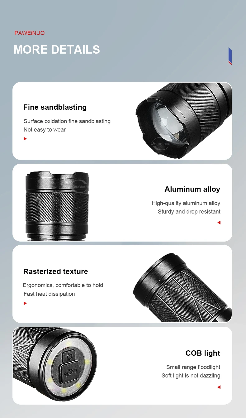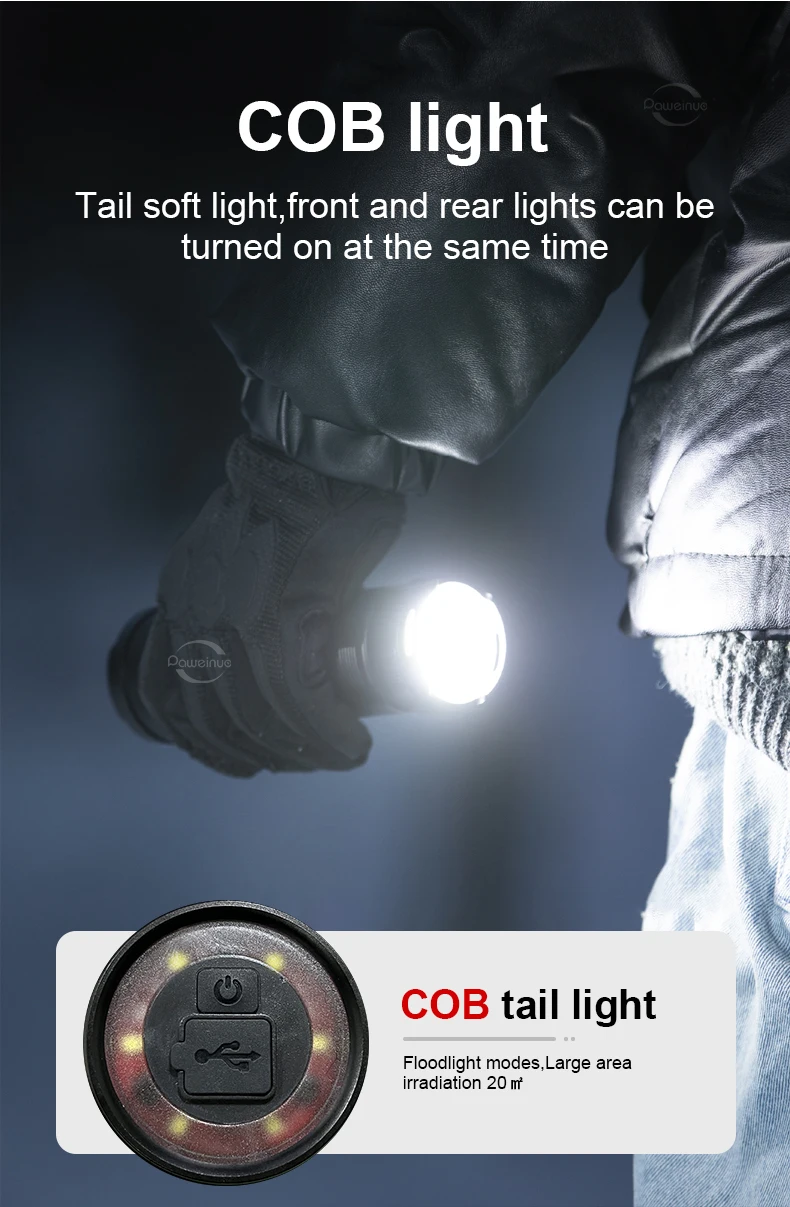 Special design: eye protection COB light; focusing technology, fast charging technology